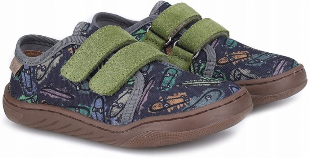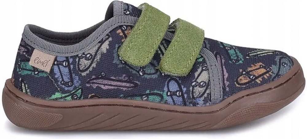 Dětské bavlněné tenisky značky Emel od model EK6000A-2 v modrozelené barvě s barevnými skateboardy se zapínáním na dva suché zipy. Boty byly navrženy v souladu s vizí barefootu. Anatomický tvar podrážky připomíná tvar chodidla, díky čemuž má noha a zejména její přední část dostatek místa. Podrážka a stélka jsou zcela jednoduché, tzv. „zero drop“, což znam...