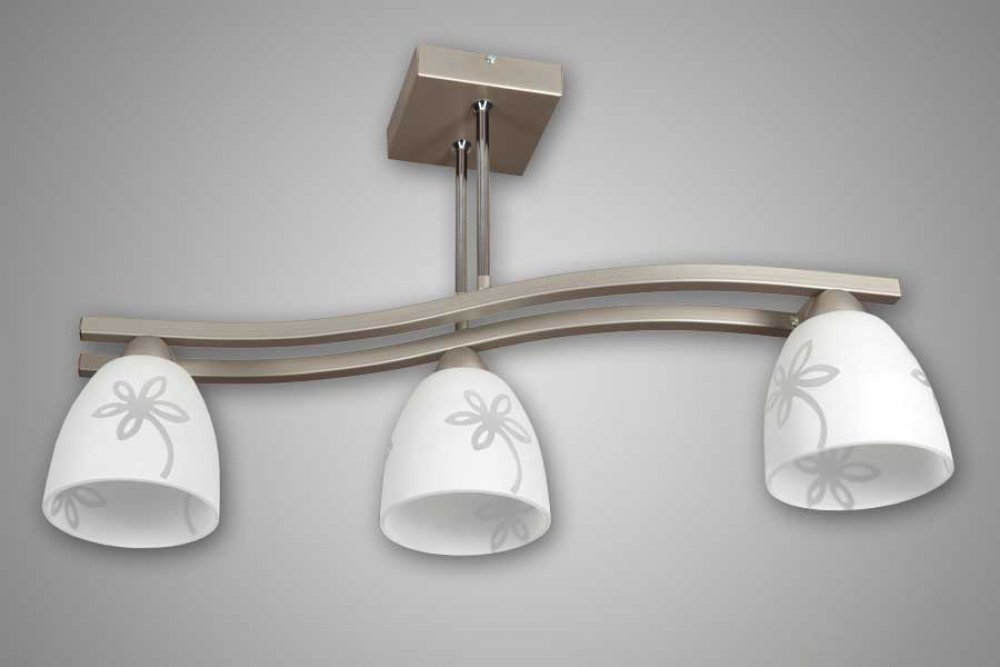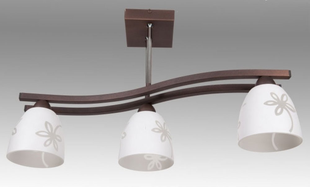 Lustr vyrobený z kovu v povrchové úpravě hnědá wenge v kombinaci s chromovou tyčkou. Stínidlo skleněné bílé s motivem kytičky. Lustr lze zapojit na vypínání 0+3 nebo na přepínání 1+2. Dodáváno bez žárovek, možné použít klasické, úsporné i LED.
