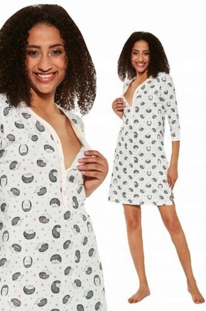 Emili - bavlněná noční košile, s tříčtvrtečním rukávem, celovzorována ježky. Výstřih pokračuje hlubokým rozepínáním, které vám ulehčí oblékání, využijete ho při kojení, či bude jen efektním detailem. Délka košile je nad kolena, s rozparky po stranách spodní části.