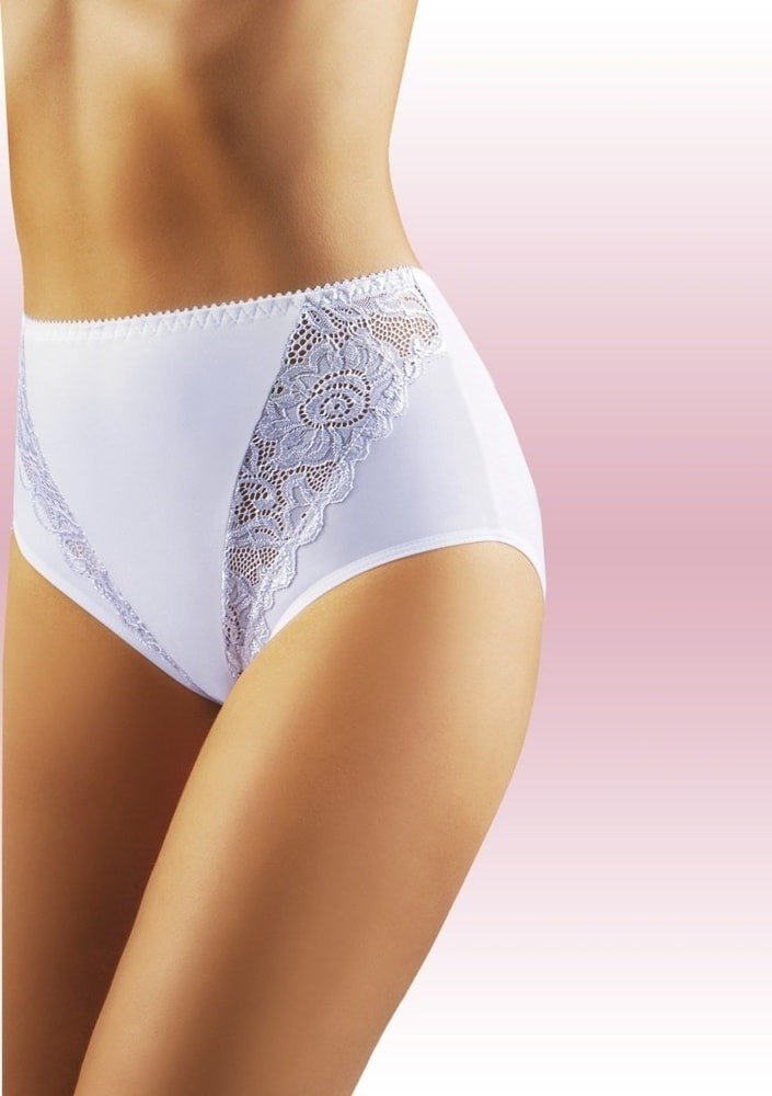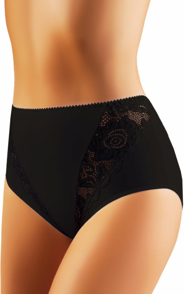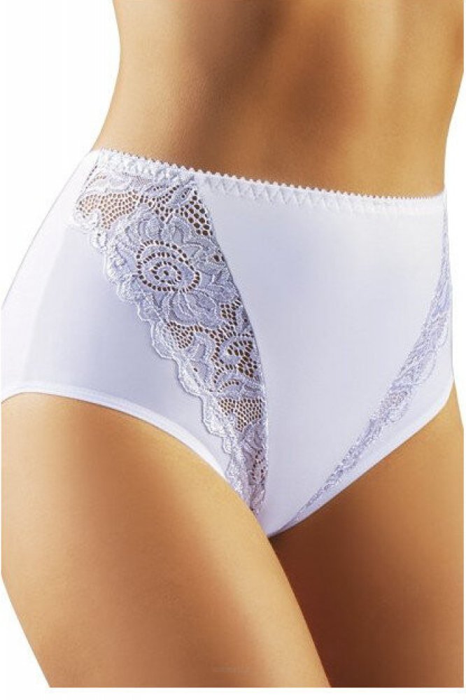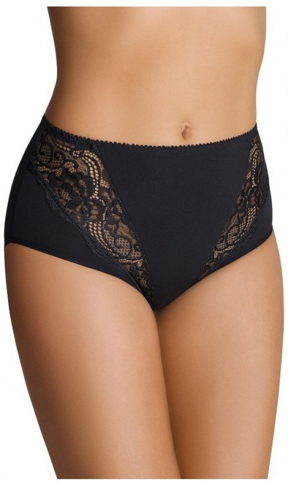 Dámské kalhotky se zvýšenou linií pasu jsou ozdobené krajkovými průhledy v přední části. Vnitřní část rozkroku kalhotek je podšita bavlněnou látkou.