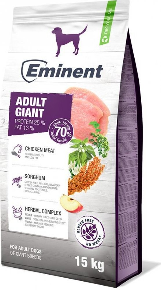 Obsahuje minimálne 70 % bielkovín živočíšneho pôvodu. 250 g dehydrovaného hydinového mäsa v 1 kg krmiva zodpovedá 930 g čerstvého mäsa. Krmivo je špeciálne vyrobené pre rasy psov, ktoré v dospelosti dosahujú hmotnosť nad 45 kg. Granule sú dostatočne veľké, čo vedie k zamedzeniu prehĺtania potravy a núti psa krmivo rozhrýzť. Vďaka tomu je krmivo ľahšie stráviteľné. Počas hryzenia dochádza aj k obrusovaniu zubného kameňa. Chutná receptúra má vyvážený obsah energie, aby nedochádzalo k nežiaducemu navýšeniu hmotnosti. Krmivo obsahuje nevyhnutné chondroprotektíva na udržanie pohybového aparátu v skvelej forme. PROTEIN 25 % / TUK 13 % Zloženie: dehydrované hydinové mäso (25 %), kukurica, hrach, cirok (9 %), hydinový tuk, ryža, hydrolyzovaná hydinová pečeň, ľanové semienko, sušené jablká, cukrovarské rezky, kokosový olej, MOS (mannanoligosacharidy), FOS (fruktooligosacharidy), beta-glukány, bylinný komplex (žihľava, plod anízu, Yucca schidigera), glukosamín, chondroitín sulfát, doplnkové látky (vitamíny, mikroprvky, aminokyseliny). KĹBY Chondroitín a glukosamín zaisťujú správnu funkciu pohybového aparátu. Omega-3 mastné kyseliny pôsobia preventívne proti zápalu kĺbov. IMUNITA Beta-glukány, MOS a FOS posilňujú imunitný systém. Vitamíny E a C zvyšujú obranyschopnosť organizmu, podporujú ochranu a regeneráciu buniek. CHRUP Optimálny pomer vápnik/fosfor a tiež ideálny tvar a štruktúra granúl podporujú zdravý chrup.