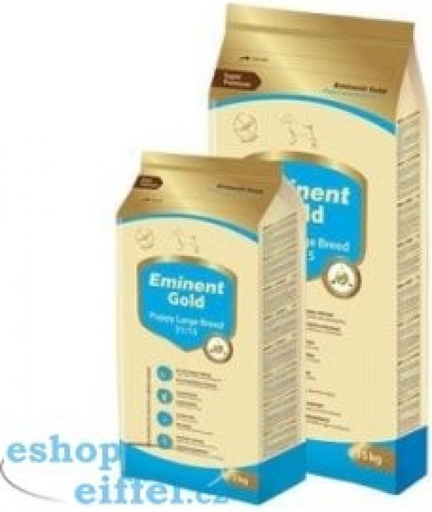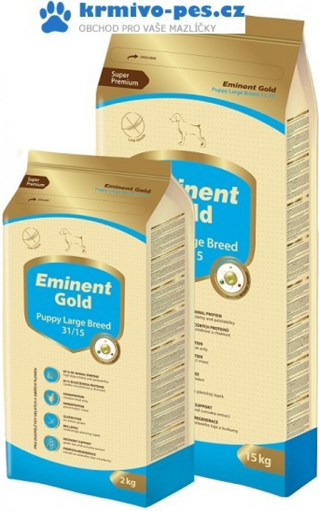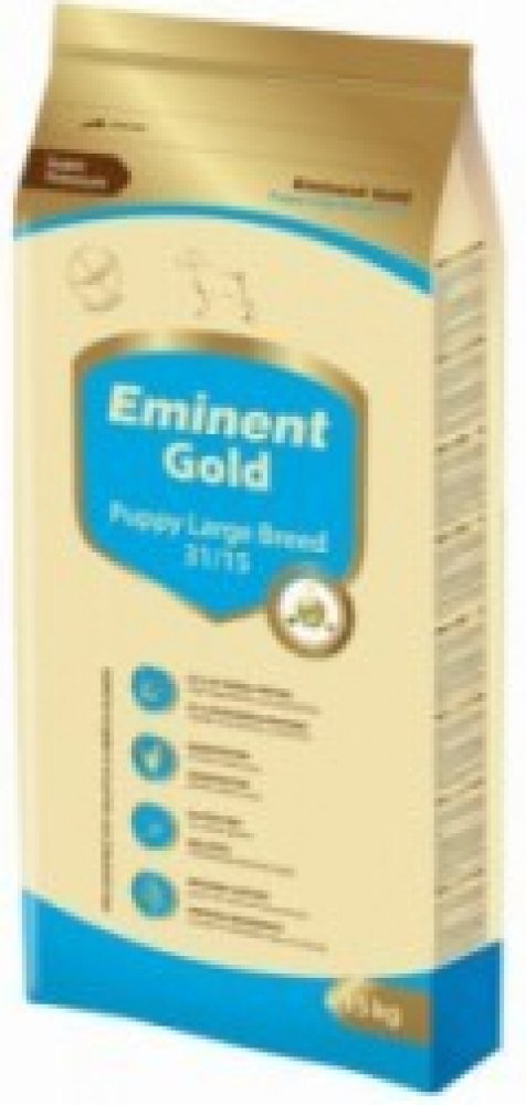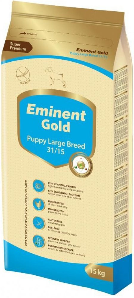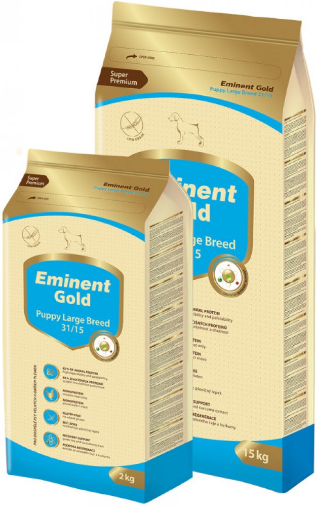 Eminent GOLD Puppy Large Breed je kompletní krmivo pro štěňata, březí a kojící feny velkých a obřích plemen. Rychlý růst štěňat velkých a obřích plemen klade velmi vysoké nároky na kvalitní výživu. Vyvážená kombinace chondroitinu, glukosaminu, MSM, organické formy manganu a minerálních látek zajišťuje kompletní a optimální výživu a vývoj pohybové soustavy. Vyvážený poměr bílkovin a energie, v podo...