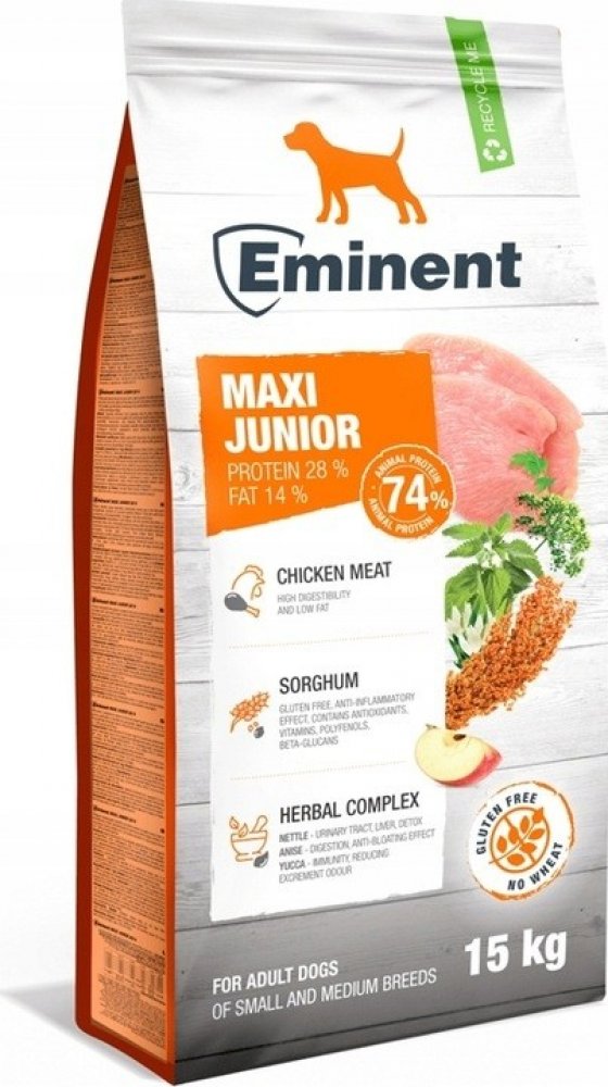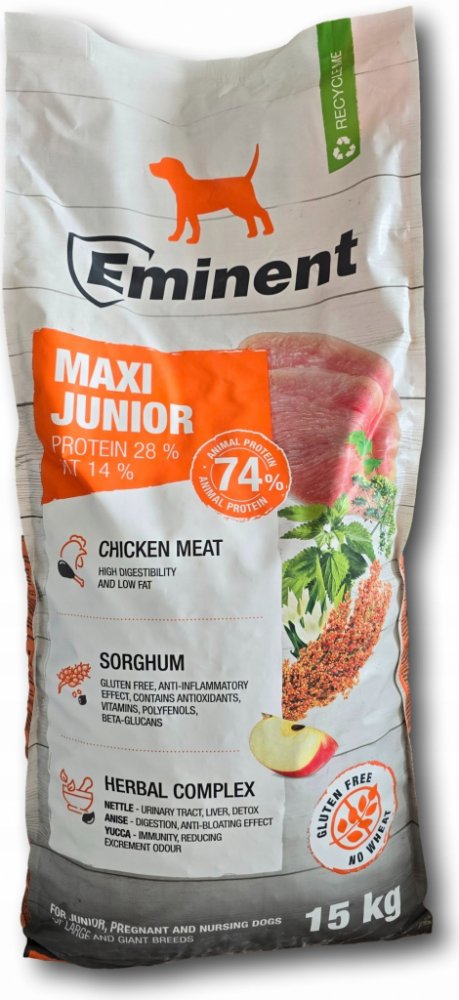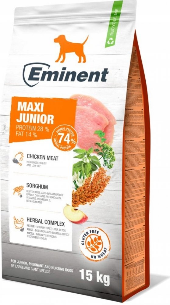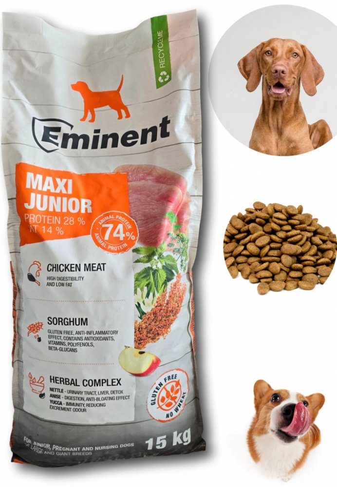 Eminent Maxi Junior 15 kg je kompletní krmivo pro štěňata a mladé psy velkých a obřích plemen, navržené tak, aby podpořilo zdravý růst, vývoj svalů a kostí a zároveň bylo šetrné k citlivému zažívání.