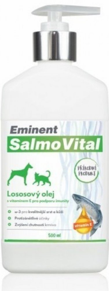 Krmný doplněk výživy lososový olej EMINENT SalmoVital s vysokou hladinou vitaminu E pro podporu imunitního systému pro psy i kočky.- snižuje alergické reakce kůže- zlepšuje kvalitu srsti (hustá, pevná a lesklá)- skvělý zdroj energie, zvyšuje chutnost krmiva- prospívá pohybovému aparátu a podporuje správný růst koťat a štěňat- vynikající zdroj esenciálních omega-3 MK- přispívá k rychlejšímu hojení...