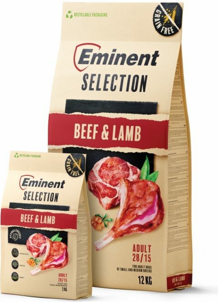 Eminent Selection Lamb & Beef – Adult je určeno pro dospělé psy všech plemen, kteří potřebují kvalitní a vyváženou stravu bez obilovin. Je ideální pro psy s běžnou i vyšší aktivitou, s důrazem na udržení kondice, vitality a silné imunity.