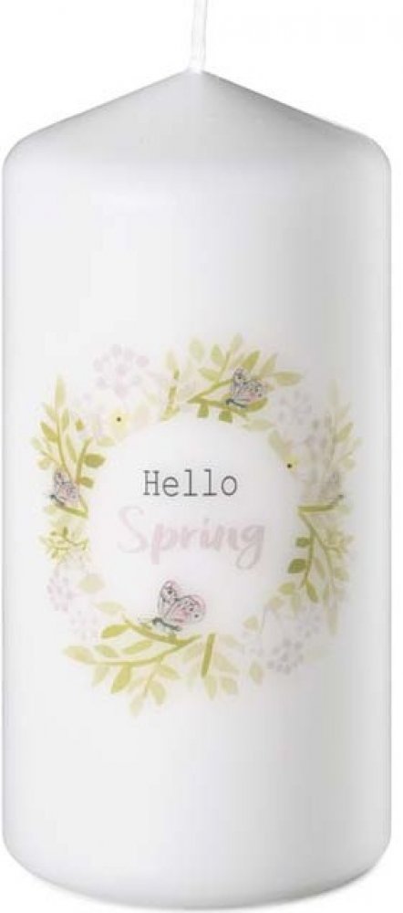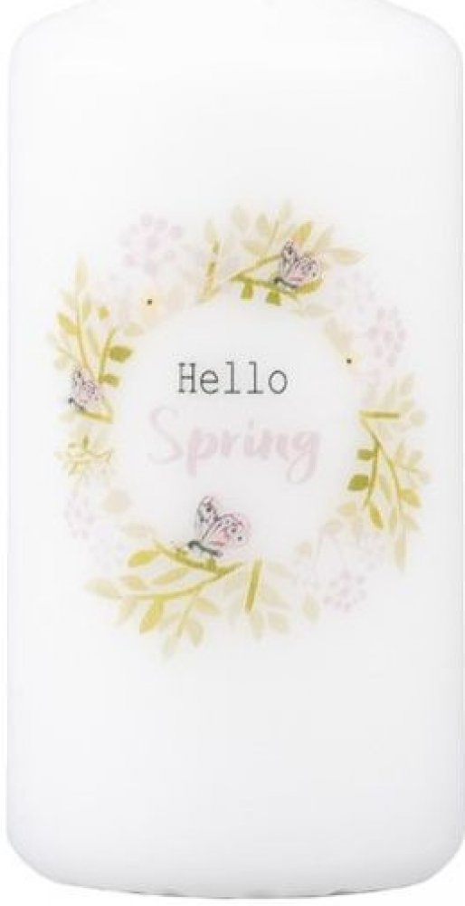 Svíčka 58×120 mm potisk jarní věnec, bílá