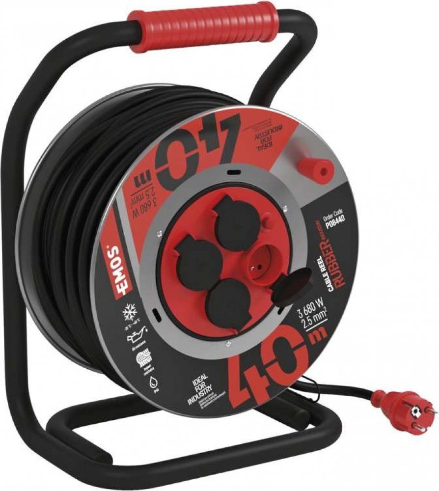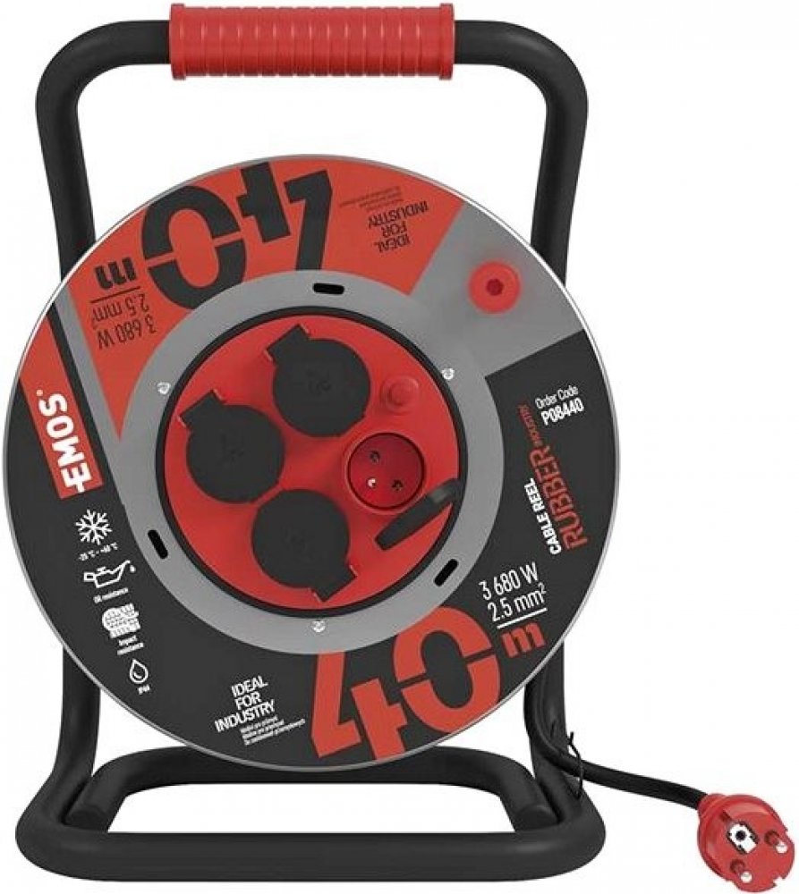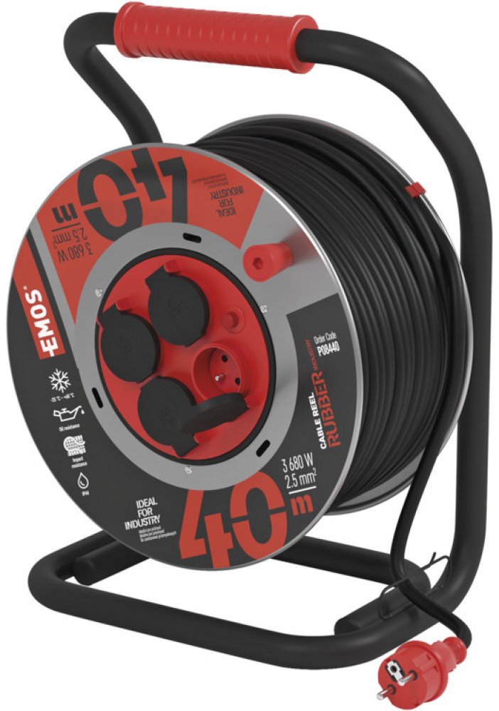 EMOS 4 40 m černé na stavbu a do dílny pro elektrické nářadí a stroje IP44 bez USB portů 16.0 A 2.5 mm² kabelový buben s běžným konektorem (Schuko / typ E/F) 3680.0 W