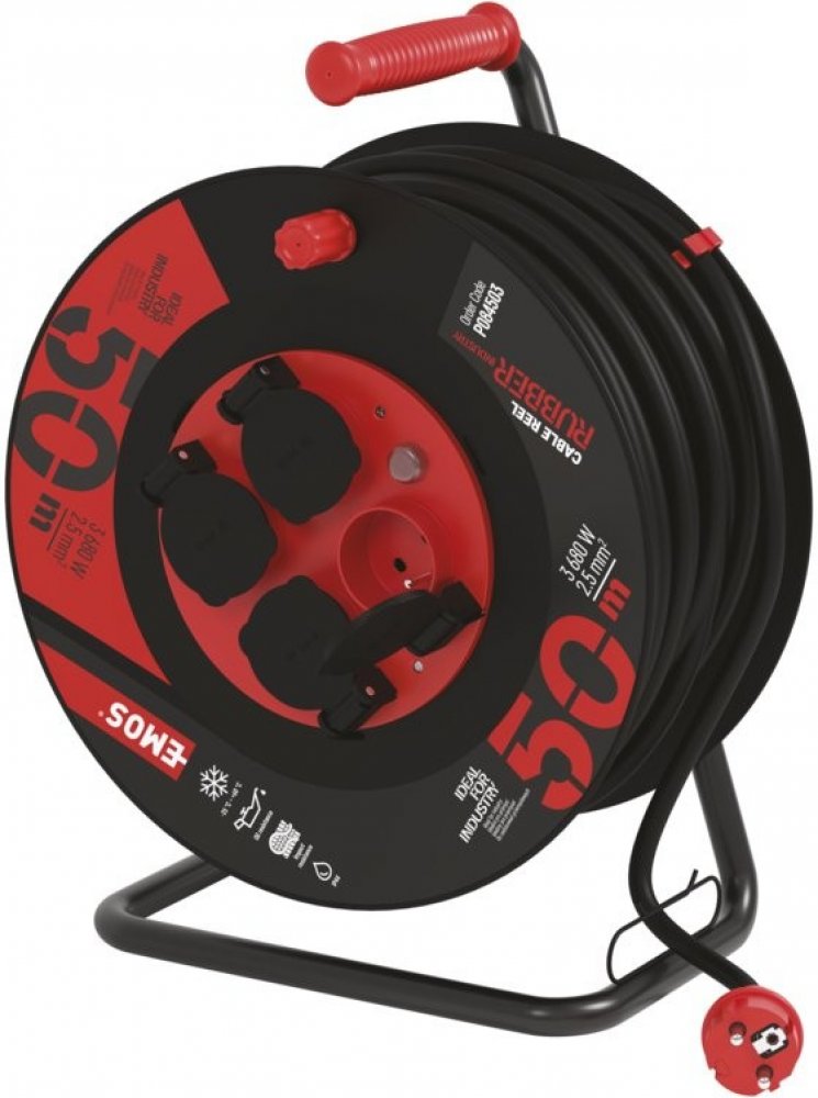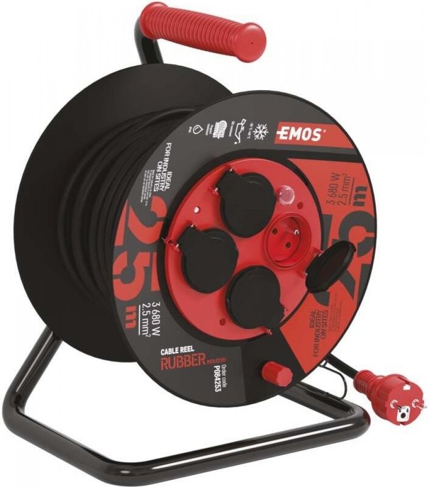 Kvalitní gumový naviják prodlužovacího přívodu. Je ideální pro prodloužení napájecí sítě 230V~. Jeho výhodou je pohodlná manipulace díky bubnu. Neoprenový kabel H07RN-F3G 2,5 mm2 lze trvale používat ve venkovním prostředí. Je vysoce odolný proti mechanickému zatížení a olejům. Možnost vyšší zátěže (průřez 3× 2,5 mm2) - svářečky, stavební vrátky, kompresory atd.