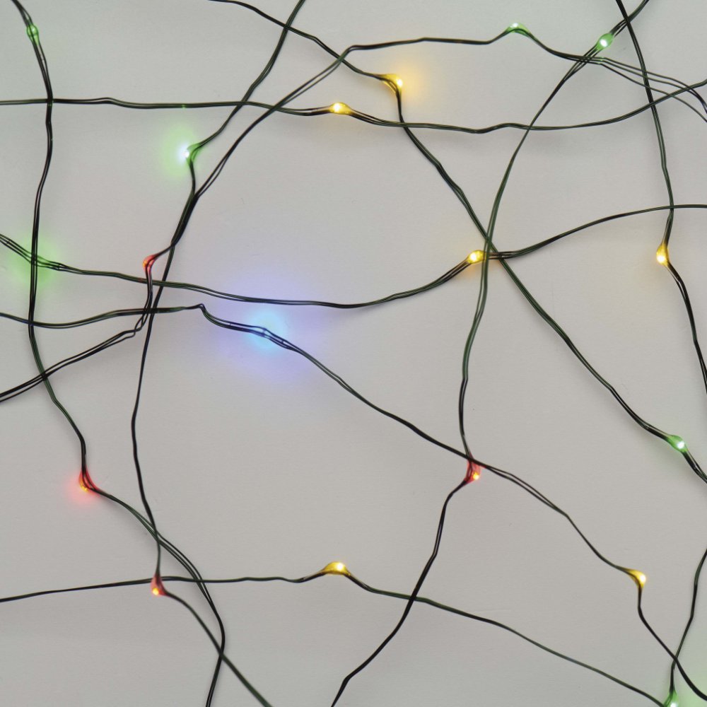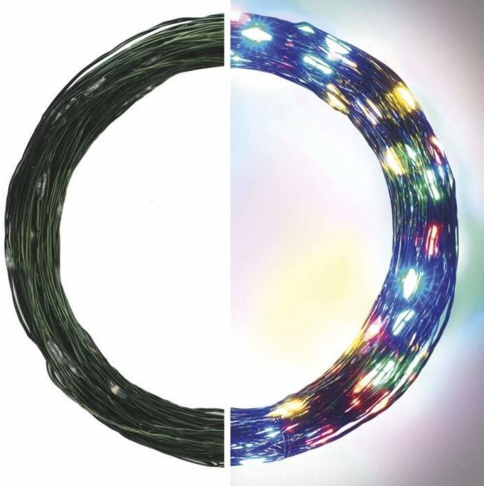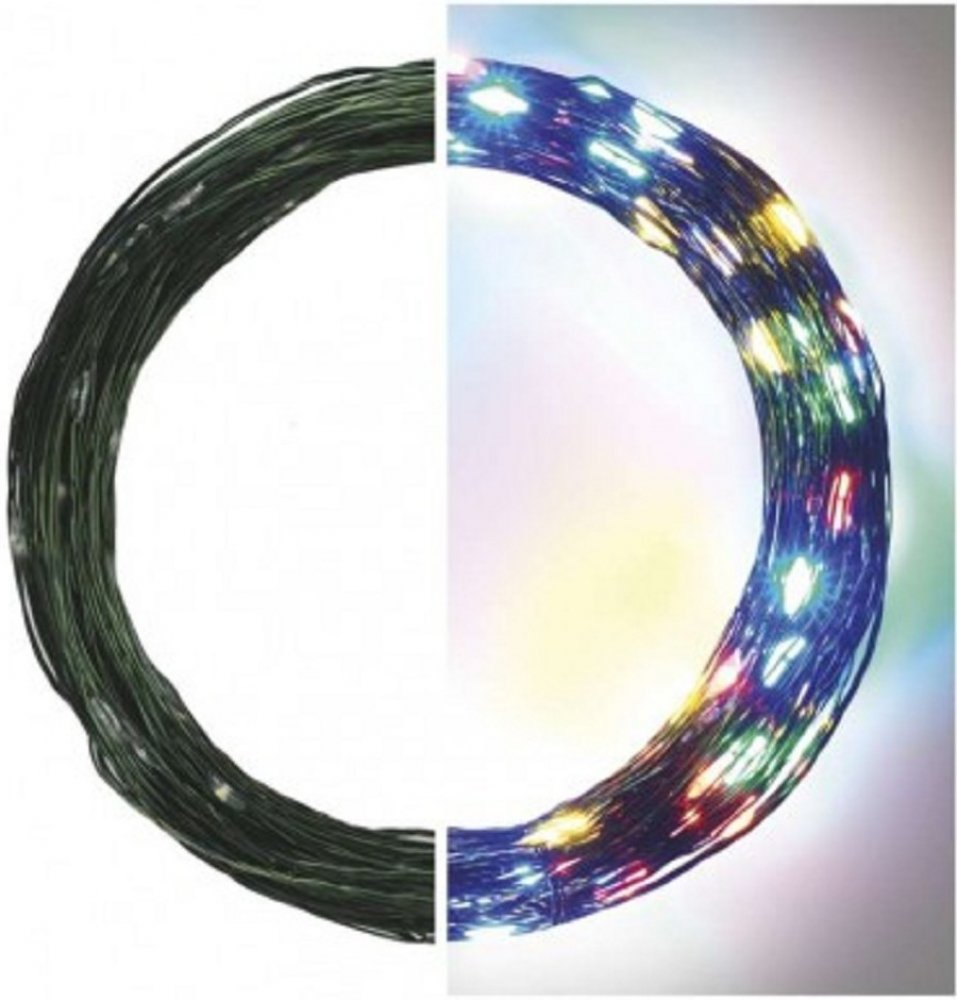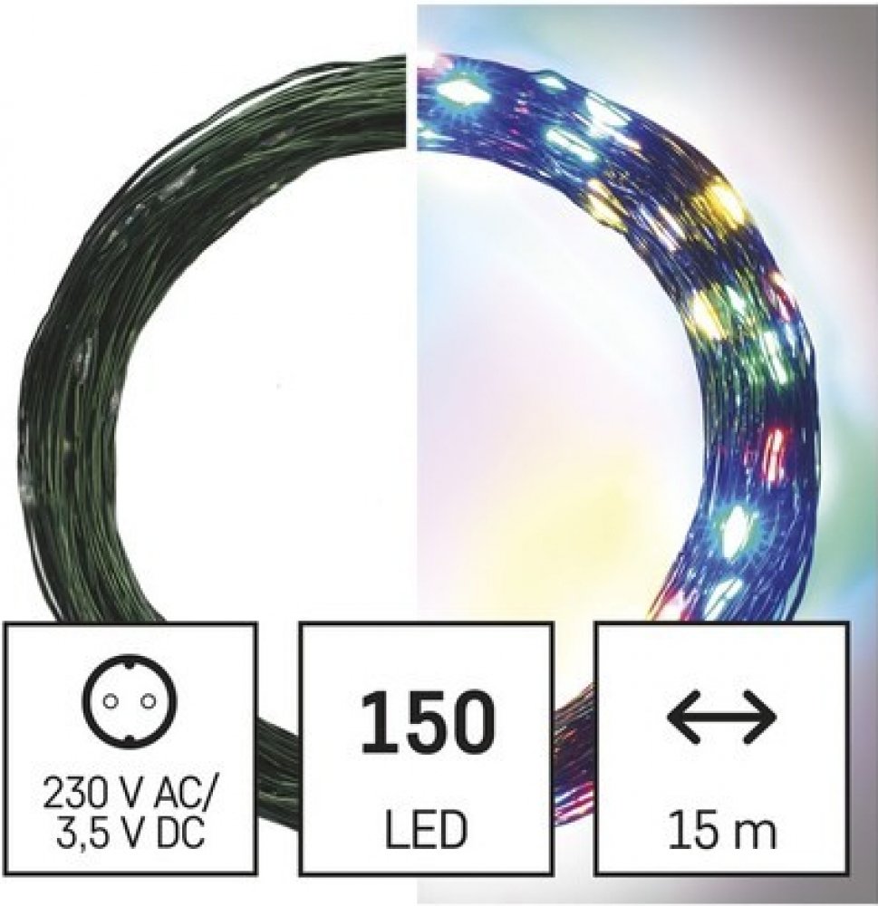 Vánoční LED světelný nano řetěz má na 15 metrech dlouhém řetězu 150 miniaturních LED diod (mix červená, žlutá, modrá, zelená) které svítí těmito barvami.
