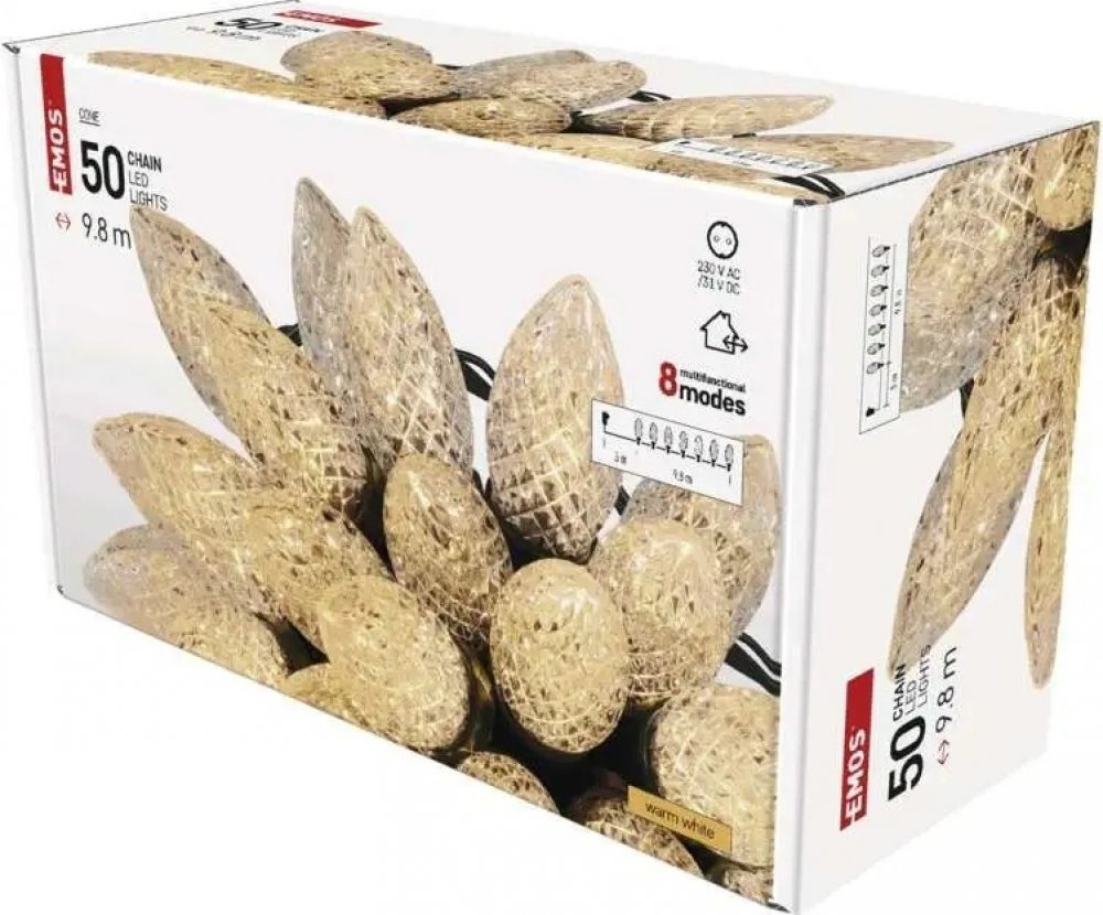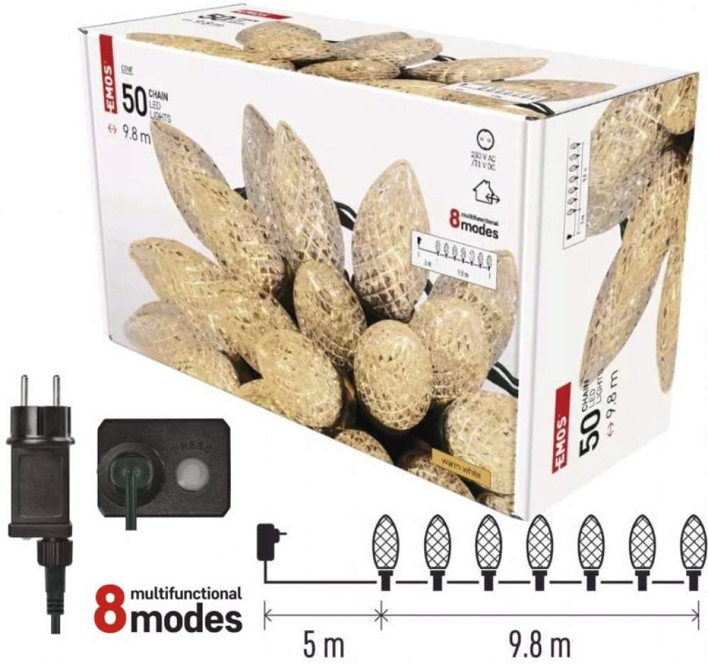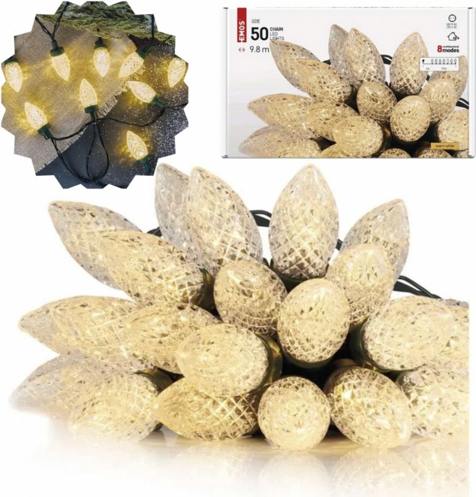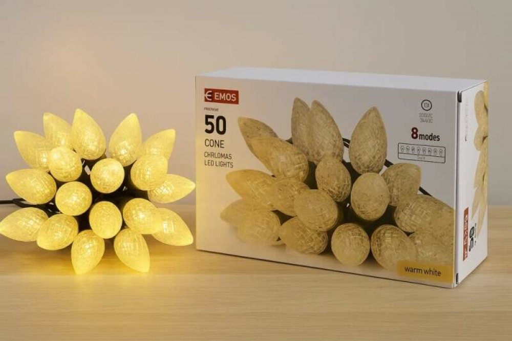 Podrobnosti o produktu 1550050008 Vánoční řetězy TRADITIONAL ve tvaru šišek s multifunkcí umožňují vybrat jeden z osmi přednastavených světelných režimů, který pak rozzáří každý prostor a potěší jak děti, tak i dospělé.