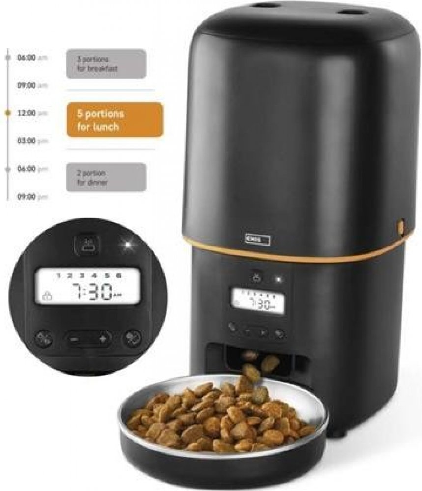 PLÁNOVANÉ KRMENÍ: Naše praktické automatické krmítko H6001 dokáže poskytnout čerstvou porci suchého krmiva podle přesného rozvrhu (max. 6 krmení denně). Hýčkejte svého domácího mazlíčka zdravým a spokojeným životním stylem.DÁVKOVÁNÍ DLE POTŘEBY: Nastavte jednotlivé dávky podle nutričních požadavků vašeho zvířete. Když je hladina krmiva nízká, na displeji bliká LED dioda, která vás upozorní, že je třeba krmivo doplnit.DVOJÍ NAPÁJENÍ: Součástí dodávky je 2m dlouhý kabel USB-C s napájecí jednotkou. Díky 3x záložním bateriím typu D nebude vaše kočka nebo pes hladovět ani v případě výpadku proudu (baterie typu D 1,5 V nejsou součástí dodávky).PRO DOMÁCNOST I NA CESTY: 4litrové krmítko se snadno sestavuje a rozkládá. Omyvatelná miska z nerezové oceli zajišťuje hygienu a požitek z jídla. Protiskluzové podložky zajišťují stabilní a bezpečné drženíOCHRANNÉ FUNKCE: Ochrana svorek pro dávkování suchých potravin o velikosti 2-15 mm bez zaseknutí. Bezpečnostní uzávěr zabraňující vniknutí mravenců a neopatrných tlapek do dávkovače. Pohlcovač vlhkosti udržuje suché krmivo stále čerstvé.Musíte opustit dům nebo jdete pozdě do práce a nemůžete svého mazlíčka včas nakrmit? Naše automatické krmítko pro domácí mazlíčky může zcela vyřešit vaše problémy s krmením a dodávat čerstvé krmivo podle přesného harmonogramu. Velikost porce je přibližně 5 gramů. Automatické krmítko pro domácí mazlíčky má na dávkovači také ukazatel stavu naplnění. Četné bezpečnostní prvky zajišťují čerstvost a připravenost krmiva k dávkování a bezpečnost vašeho domácího mazlíčka.