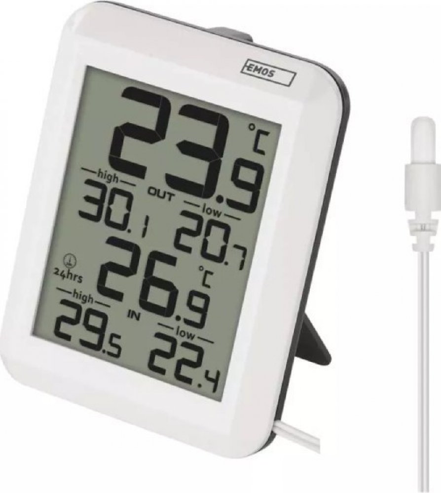 Drátový teploměr EMOS E0422 se zobrazením venkovní a vnitřní teploty, zaznamenává min. a max. teplotu. Teploměr má drátovou sondu dlouhou 0,9 m.