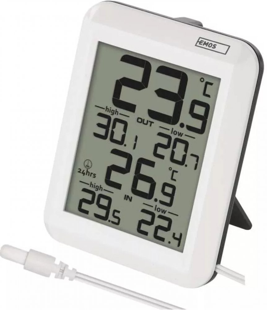 Digitální teploměr E0422Hledáte zařízení bez zbytečních funkcí a tlačítek navíc? Pak tento produkt jistě ocení všichni, kterým stačí znát pouze základní hodnoty měření bez zbytečných kudrlinek. Žádná složitá tlačítka a programy. Tento drátový teploměr potěší hlavně tím, co je nejdůležitější – a to přesným měřením teploty v interiéru i exteriéru s rozlišením 0,1 °C. Navíc také kontinuálně zaznamená maximální a minimální vnitřní a venkovní teplotu.