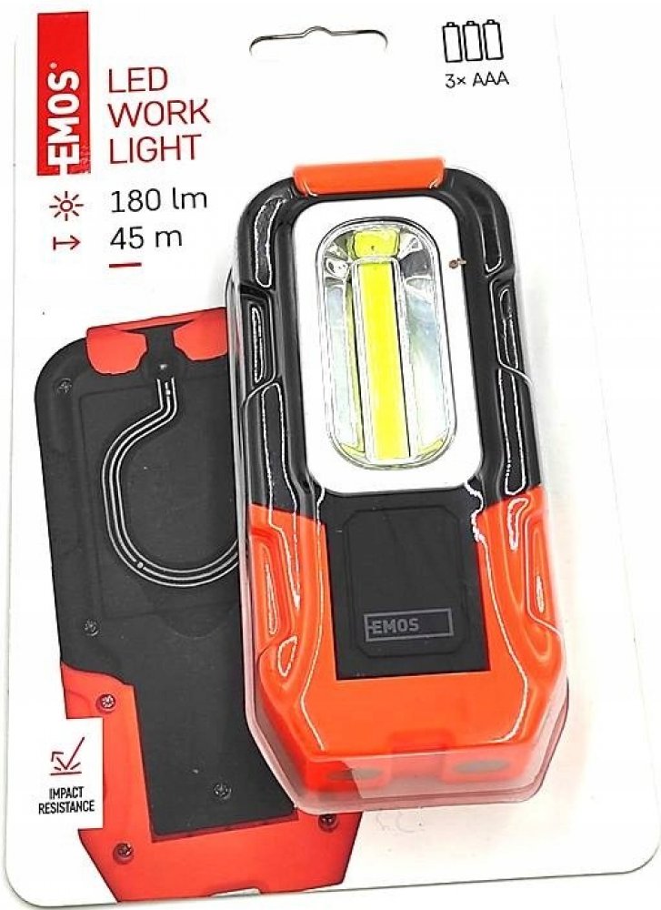 EMOS P3888 COB LED pracovní svítilna, 200 lm, 3× AAA Pracovní výkonná LED svítilna s lámací rukojetí, háčkem a magnetem. Doba svícení až 20 hodin, dosvit až 20 m, napájení 3x AAA baterie.Parametry produktu- zdroj světla: 3W COB LED