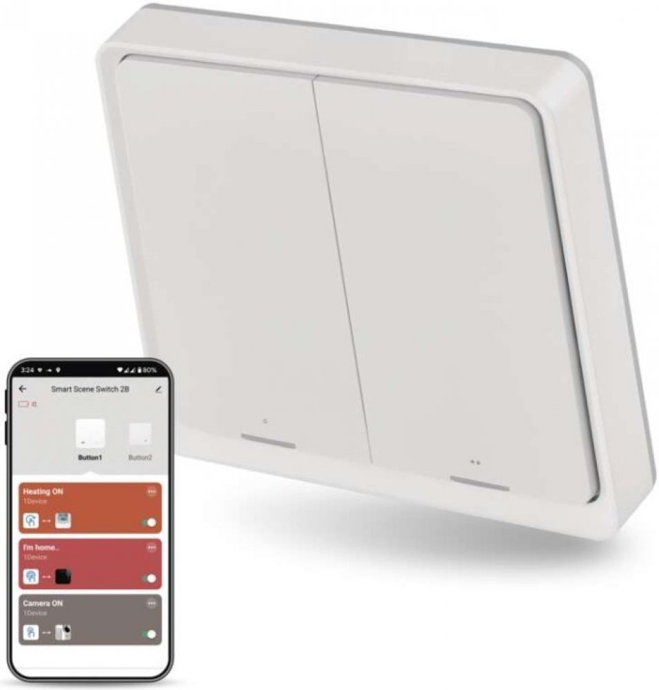 Každé z tlačítek navíc rozeznává tři polohy – standardní jednoduché stisknutí, dvojité klepnutí nebo podržení tlačítka po delší dobu. Vy tak získáváte celkem 6 kombinací, jak si nastavit a pohodlně ovládat vaši domácnost.