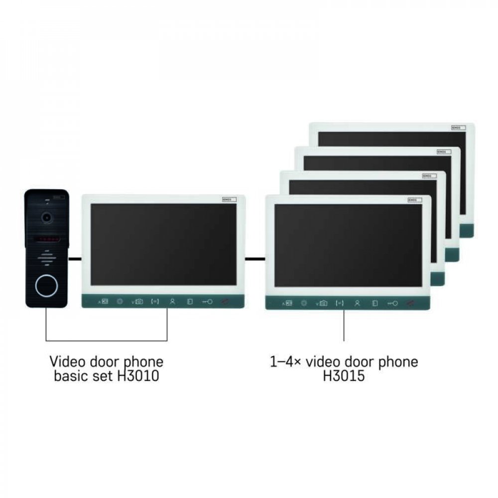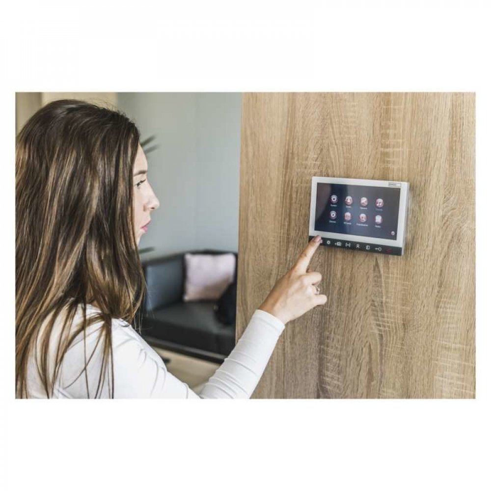 Nepůsobí rušivě, a přesto na sebe ostrým obrazem rychle upoutá pozornost, když někdo zazvoní. Kvalitní barevná obrazovka o rozměrech 175 × 125 × 20 mm s vícejazyčným menu a s přehlednými grafickými ikonami nabízí celou řadu praktických funkcí a vychytávek. V systému si vyberete jednu z deseti vyzváněcích melodií, nebo si do něj snadno nahrajete svou vlastní. A pokud zrovna monitor nepoužíváte, můžete jeho obrazovku nechat zcela zhasnout nebo na displeji zobrazit hodiny.