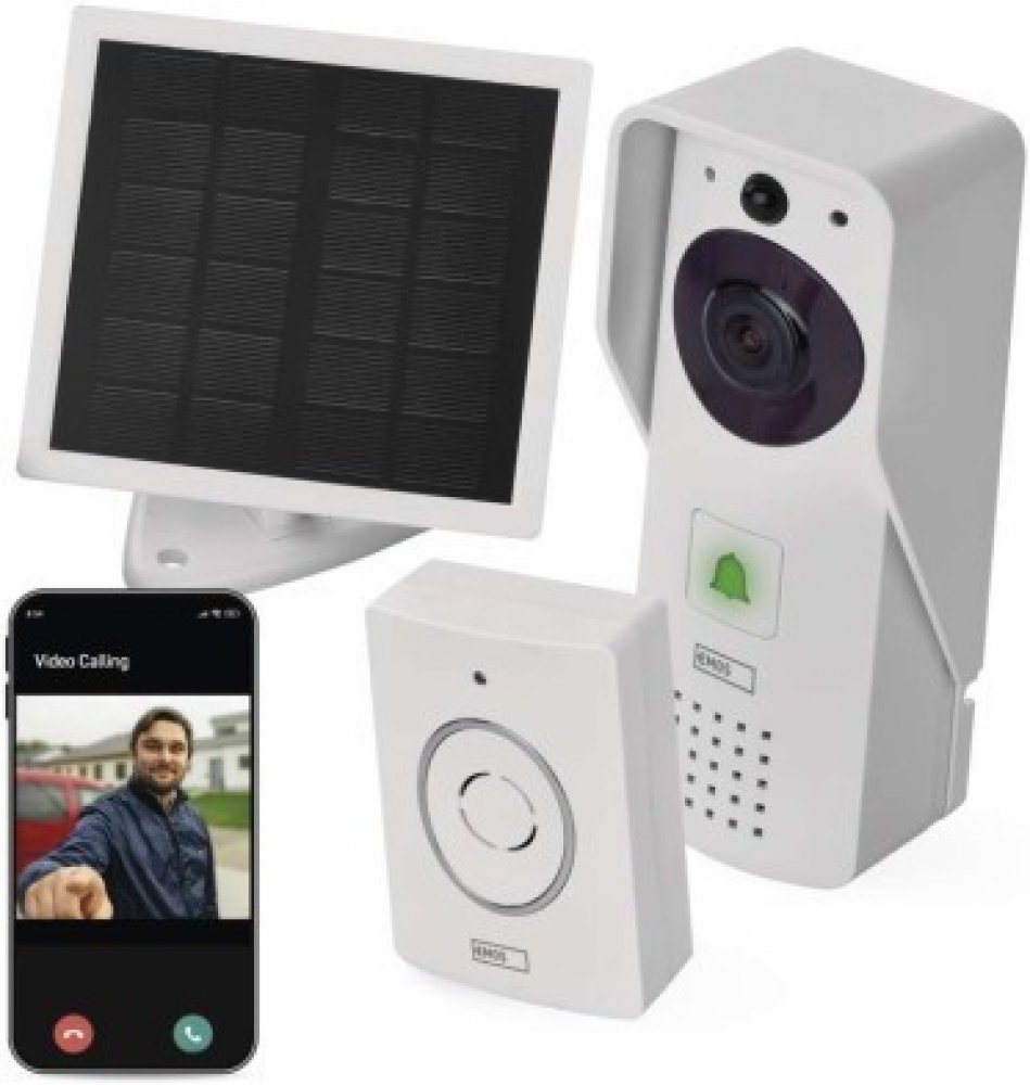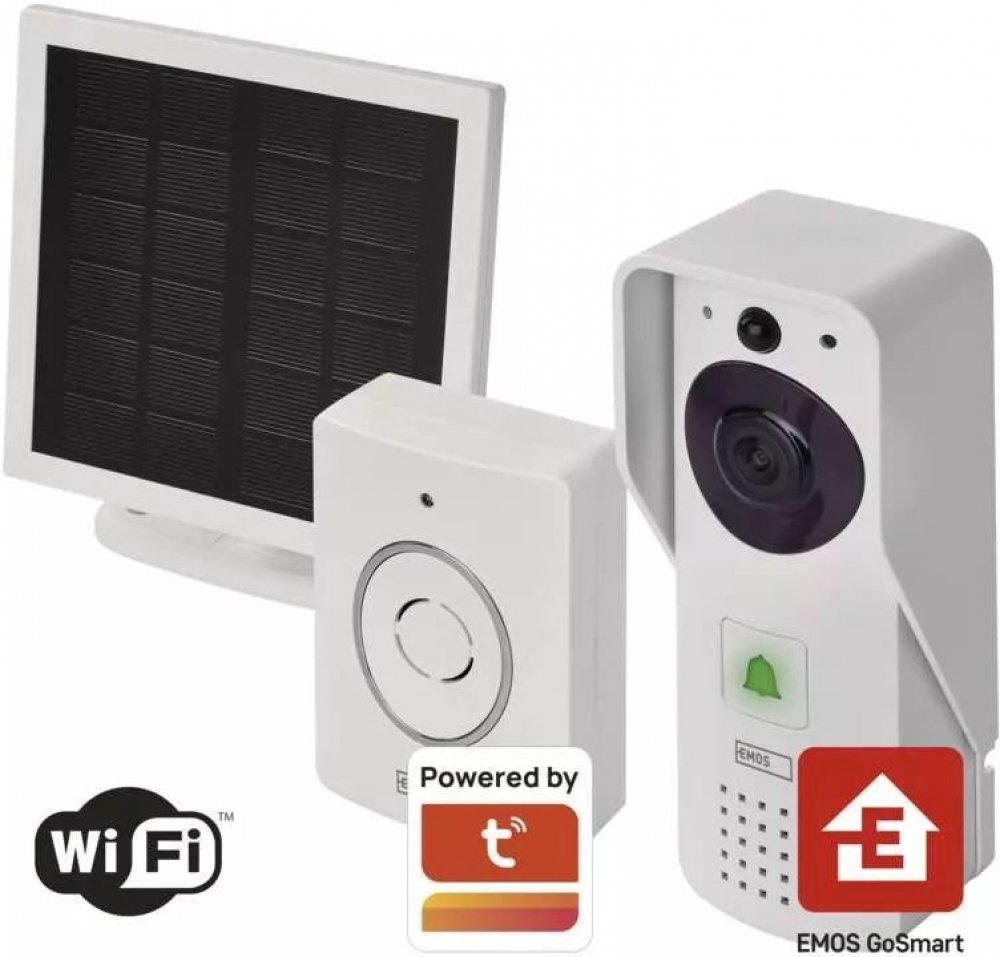 obsah balení: 1× dveřní kamerová jednotka, 2× baterie Li-Ion 18650, 1× dešťová clona, 1× solární panel, 1× propojovací kabel, 1× bezdrátový zvonek, 1× instalační materiál, 1× manuál