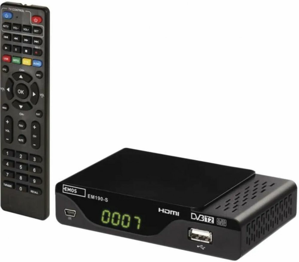Popis produktu Set-top box EMOS EM190-S H265 umí přijímat současné digitální vysílání DVB-T i nadcházející typ DVB-T2. Kromě toho bezproblémově dekóduje obrazový formát H.264 i H.265 (HEVC), který je ke správnému přenosu televizního vysílání nutný. Díky tomu si užijete své oblíbené seriály a filmy ve Full HD kvalitě. aktualizace přes USB: ano|dálkový ovladač součástí: ano|DVB-T/DVB-T2: DVB-T2|EPG program. průvodce: 7 dní|formát: mpeg 2, mpeg 4, h.264, h.265, HEVC|formát nahrávky: TS volně přehratelný|formát souborů pevného disku: FAT16, FAT32, NTFS|formáty fotek: jpeg, bmp, png|formáty videa: .avi, .mpg, .dat, .vob, .div, .mov, .mkv, .mjpeg, .ts, .trp, mpeg2, mpeg4, mpeg1, h264, h265|formáty zvuku: mp3, aac, m4a, mpa|frekvenční rozsah tuneru: 174–230MHz, 474–860 MHz|hry: neuvádí se|integrované CI rozhraní: ne|jazyk OSD menu: CZ, PL, SK, HU, EN, SI, GER, HR, RU, TU, SRB, LT, LV, SE, FI, BG, NL, FR, NO, IT, ES, PT|konektory: 1× USB 2.0, 1× HDMI 1.4, 1× miniUSB, 1× IEC, 1× SCART|ladění: automatické i manuální|max. počet souběžných nahrávání: 1|možnost editace seznamu kanálů: ano|možnost nahrávání (PVR): ano, přes USB až 1 TB|možnost příjmu rádia: ano, přes DVB-T, DVB-T2|napájení: 220–240 V AC 50/60 Hz|napájení antény: 5 V/100 mA|počet tunerů: 1×|poměr stran: 4:3PS/4:3LB/16:9|příjem vysílání (SD/HD): SD, HD|prodejní obal: 1 ks, krabice|rodičovský zámek: ano|rozlišení videa: 1080p/1080i/720p/480p/576p/480i/576i|rozměr: 120 × 75 × 25 mm|spotřeba (zapnutý/stand-by): 5 W/