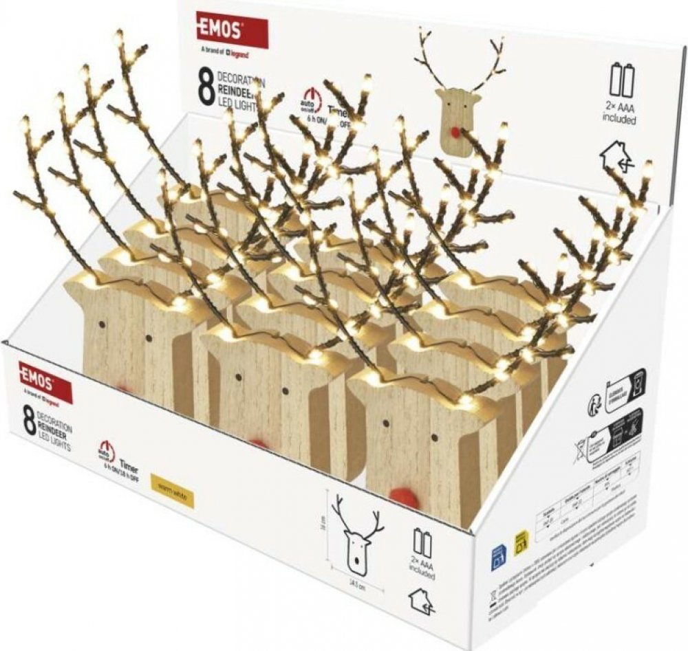 EMOS LED dekorace dřevěná sob 16 cm 2x AAA vnitřní teplá bílá časovač,12 ks display box