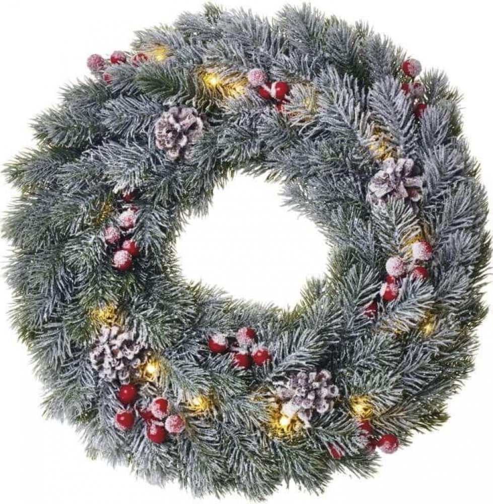 LED dekorační věnec je k nerozeznání od přírodního věnce vyrobeného z pravých větviček. Je ozdoben dvaceti LED světýlky, která vyzařují teplou bílou barvu. Světýlka jsou napájena AA bateriemi (nejsou součástí balení). Věnec můžete dozdobit dalšími dekoracemi dle vlastních představ, získáte tak svůj vlastní originální věnec na vánoční stůl, vchodové dveře, či na jakékoli jiné místo. Věnec je opatřen praktickým časovačem, prostřednictvím něhož se opakovaně rozsvítí po dobu 6 hodin a následně se na 18 hodin vypne. Zasněžený vánoční věnec se světýlky vykouzlí tu pravou útulnou vánoční atmosféru.