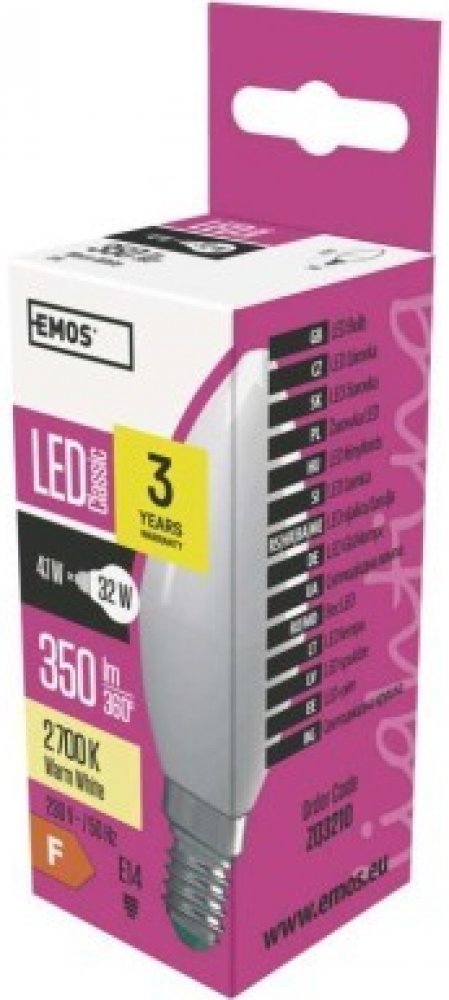 teplá bílá 2700 K F svíčka Emos 30000 h 350 lm E14 80