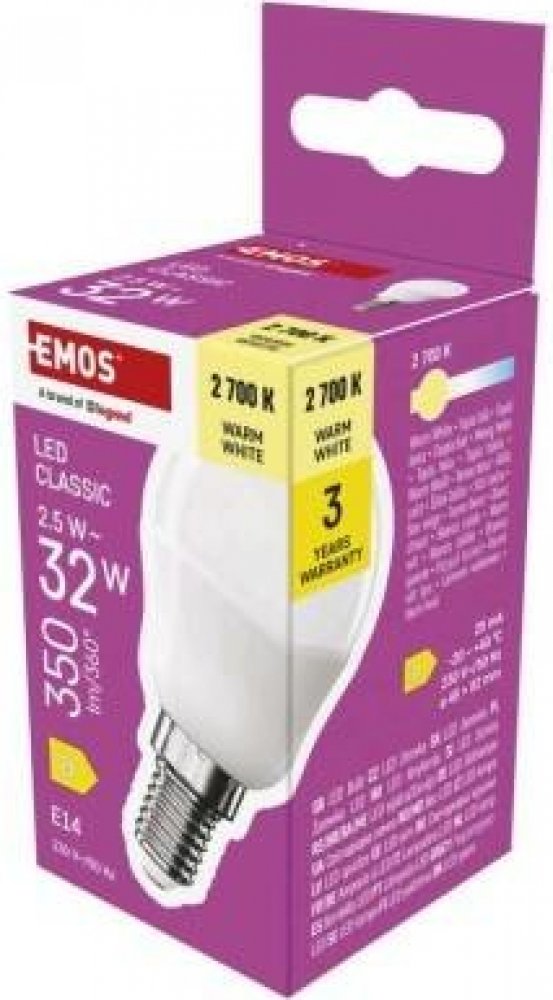 teplá bílá 2700 K D globe Emos LED žárovky 30000 h 350 lm E14 2.5 W 230 V 80