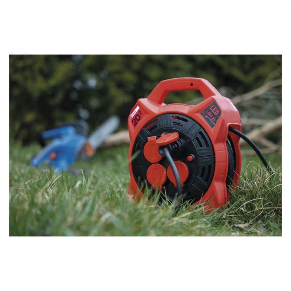 Pohyblivý střed bubnu umožňuje snadné navíjení a odvíjení kabelu bez zadrhávání. Díky 20metrové délce máte dostatečný dosah i ve velkém prostoru. Rukojeť, stabilní konstrukce a červený kabel pro lepší viditelnost zajišťují bezpečnou a pohodlnou manipulaci. Zásuvky jsou dobře přístupné a kompatibilní s běžnými spotřebiči i nářadím.