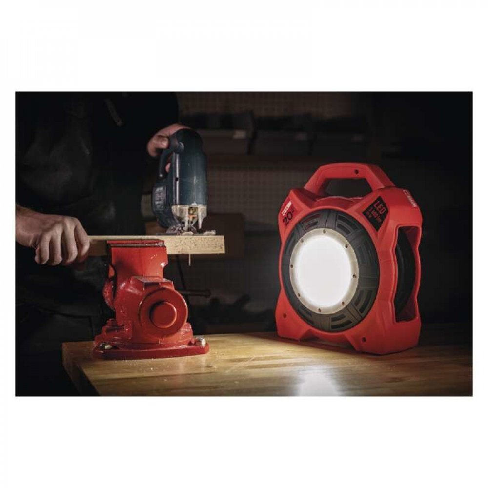 Vestavěný LED reflektor o světelném toku 1 600 lm (ekvivalent cca 130W žárovky) poskytuje dostatečné osvětlení i ve ztížených podmínkách. Studená bílá barva světla 6 500 K zajišťuje ostrý kontrast, ideální pro přesnou práci v šeru nebo tmě. Díky kombinaci s prodlužovacím kabelem vám odpadá potřeba zvláštní lampy nebo reflektoru.