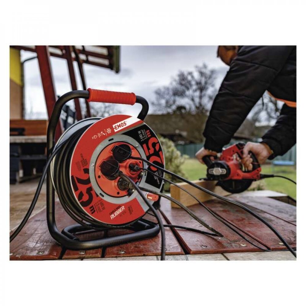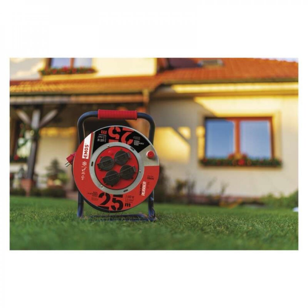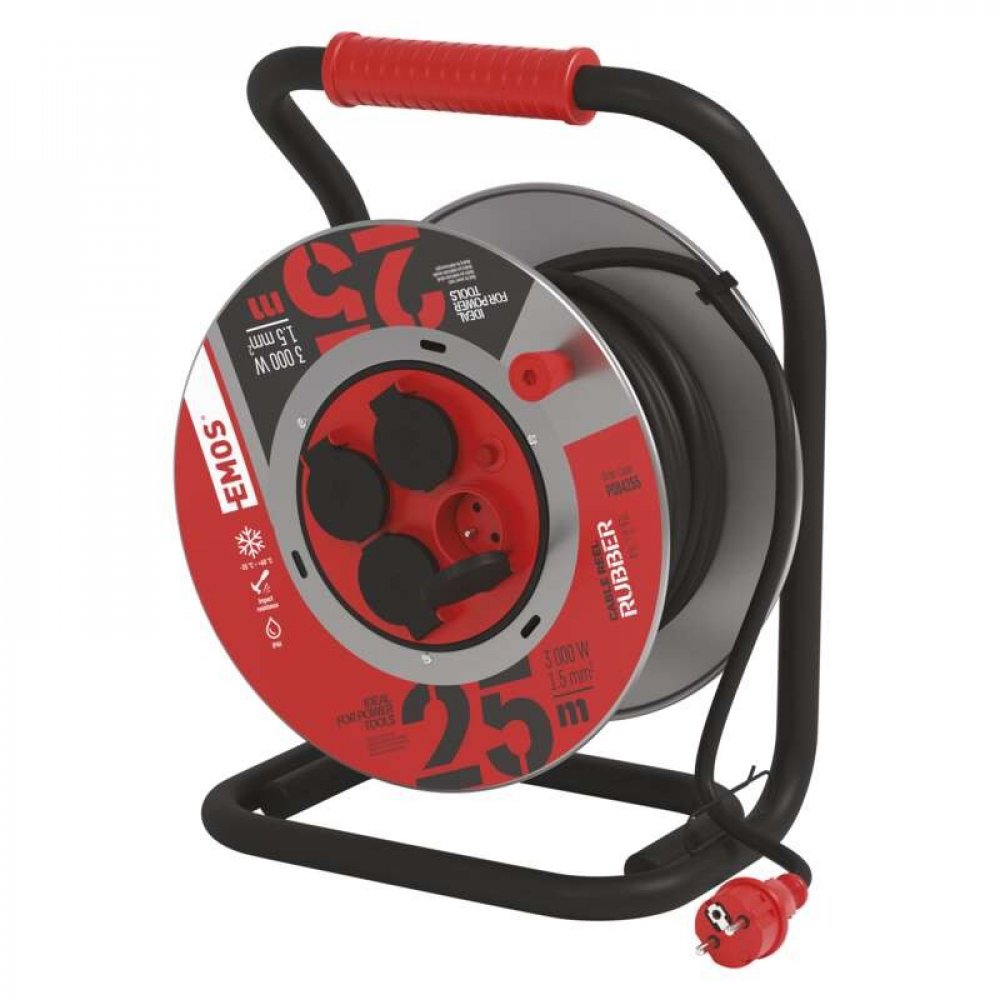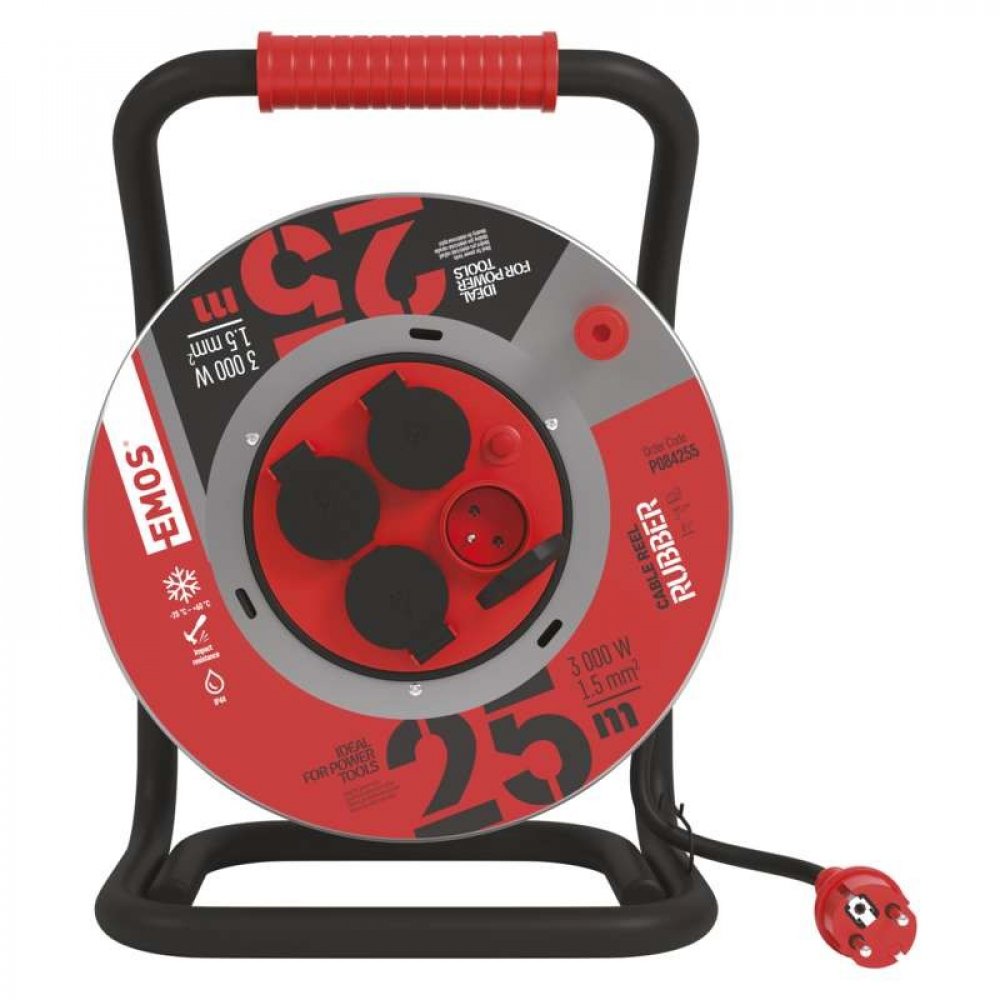 EMOS 4 25 m černé univerzální (interiér i exteriér) pro elektrické nářadí a stroje bez USB portů IP44 16.0 A 1.5 mm² kabelový buben s běžným konektorem (Schuko / typ E/F) 3680.0 W