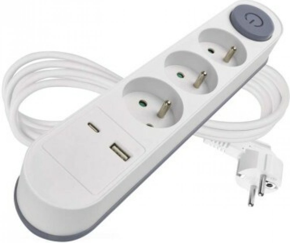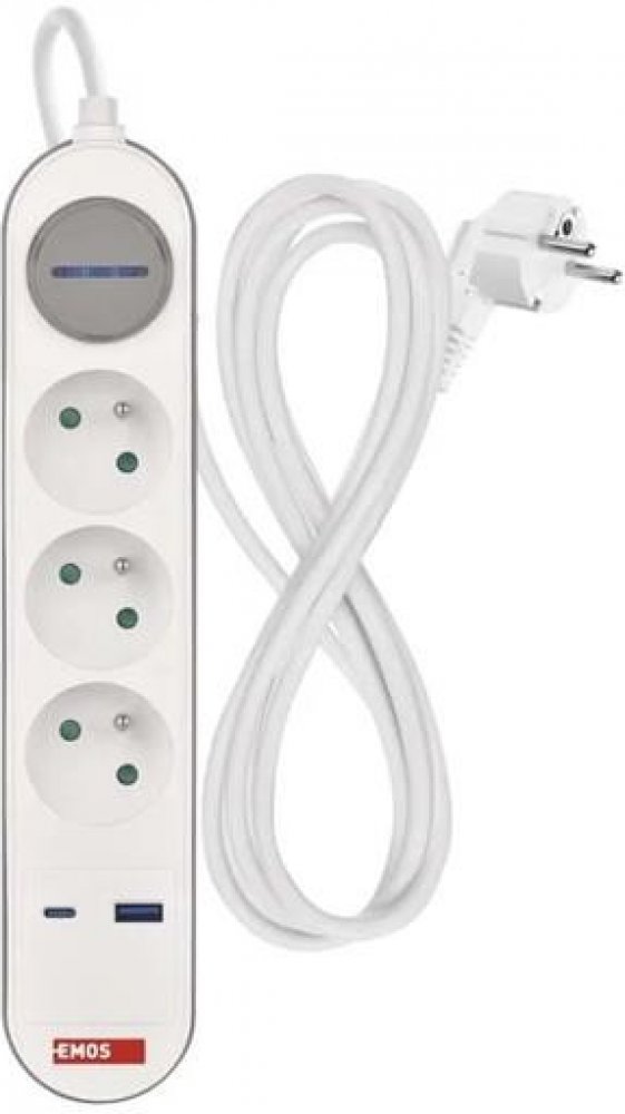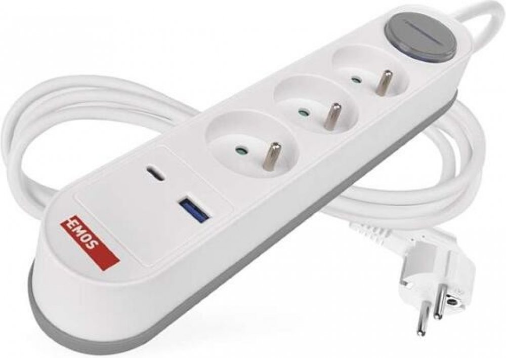 EMOS prodlužovací kabel 2m s 3 zásuvkami, vypínačem, USB-A a USB-C, bílo-šedý, 1,5 mm2. EMOS prodlužovací kabel P1312FC o délce 2 metry nabízí praktické řešení pro vaše potřeby napájení. Vybaven je třemi zásuvkami pro bezpečné připojení více zařízení současně. Kabel je vybaven pohodlným vypínačem pro snadné ovládání napájení bez nutnosti odpojení ze zásuvky. Bílo-šedé provedení skvěle zapadne do každého interiéru, zatímco výkon je zajištěn kvalitním vodičem o průřezu 1,5 mm², který garantuje spolehlivý přenos energie. Navíc obsahuje moderní porty 1× USB-A a 1× USB-C pro rychlé a pohodlné nabíjení mobilních zařízení přímo z prodlužovacího kabelu.. Prodlužovací přívod s vypínačem. 250V~/16A max 3 zásuvky s dětskými clonkami. USB A+C 3,1 A, 15,5 W max. Délka přívodního kabelu 2 m. Vodič H05VV-F3G 1,5mm2. délka 2 m počet zásuvek 3× 2P + PE vypínač ano barva bílá, šedá průřez vodiče 1,5 mm² USB výstup 1× USB-A, 1× USB-C, total: 3,1 A – 15,5 W (fast charging) napětí 250 V~ proud 16 A max. krytí IP20 typ izolace PVC max. zátěž 3 680 W vodič H05VV-F3G materiál zásuvky a vidlice PC (polykarbonát) dětské clonky ano prodejní obal 1 ks, krabice