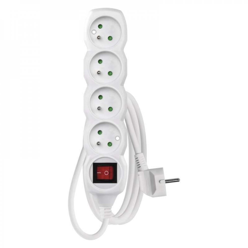 Bílý prodlužovací přívod, 4 zásuvka s vypínačem, délkou 2 m a průřezem vodiče 1 mm2. Vhodný pro maximální zátěž 10 A max.