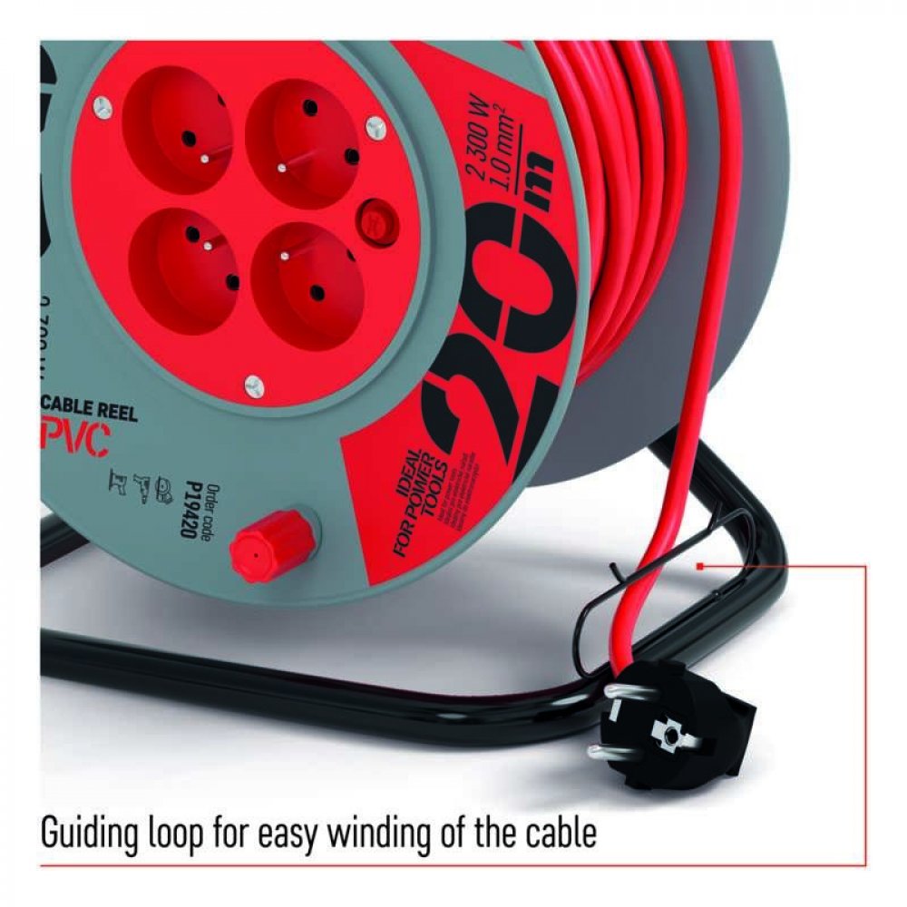 Navíjecí buben je uložen v robustním kovovém rámu a samotná cívka z ABS plastu je vysoce odolná vůči pádům a mechanickému poškození. PVC izolace vodiče typu H05VV-F3G zajišťuje dostatečnou pružnost a odolnost při použití v běžných vnitřních podmínkách. Tento model je kompaktní, lehký a snadno přenosný, přesto dostatečně výkonný pro většinu elektrického nářadí nebo spotřebičů.