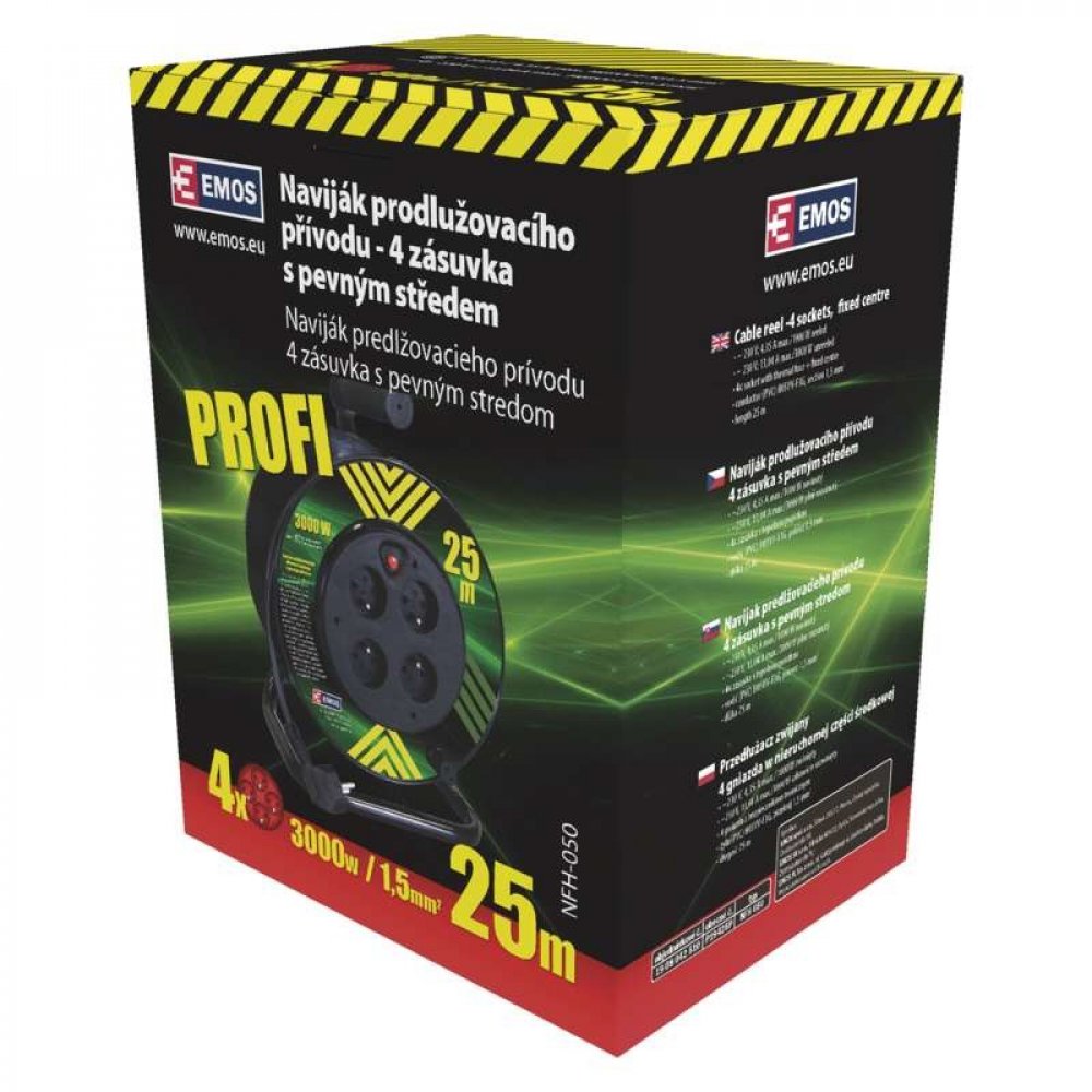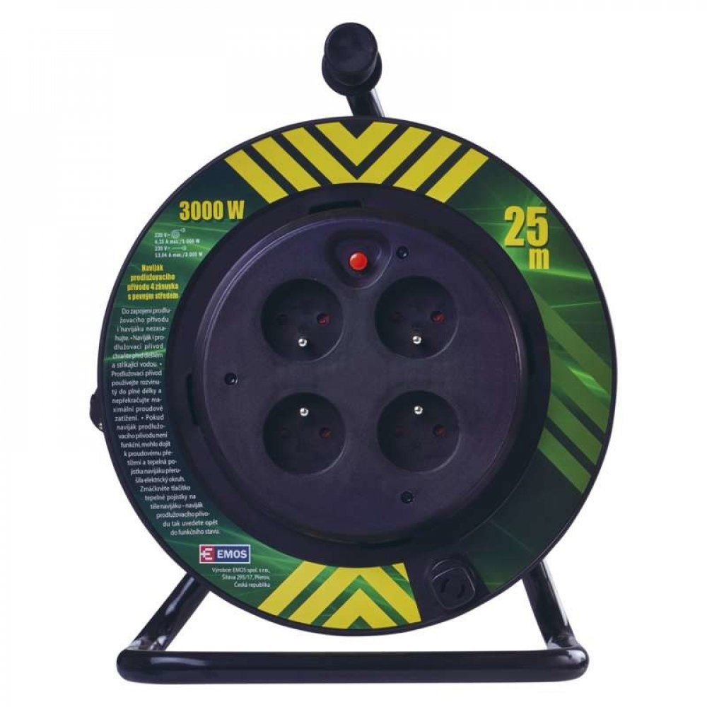 Naviják prodlužovacího přívodu s fixovaným středem. 4 zásuvky 230V~. Délka prodlužovacího přívodu 25m. Vodič PVC - H05VV-F3G 1,5mm2.Naviják má fixovaný střed což je obrovskou výhodou při manipulaci (rozmotávání/namotávání) s připojenými spotřebiči.