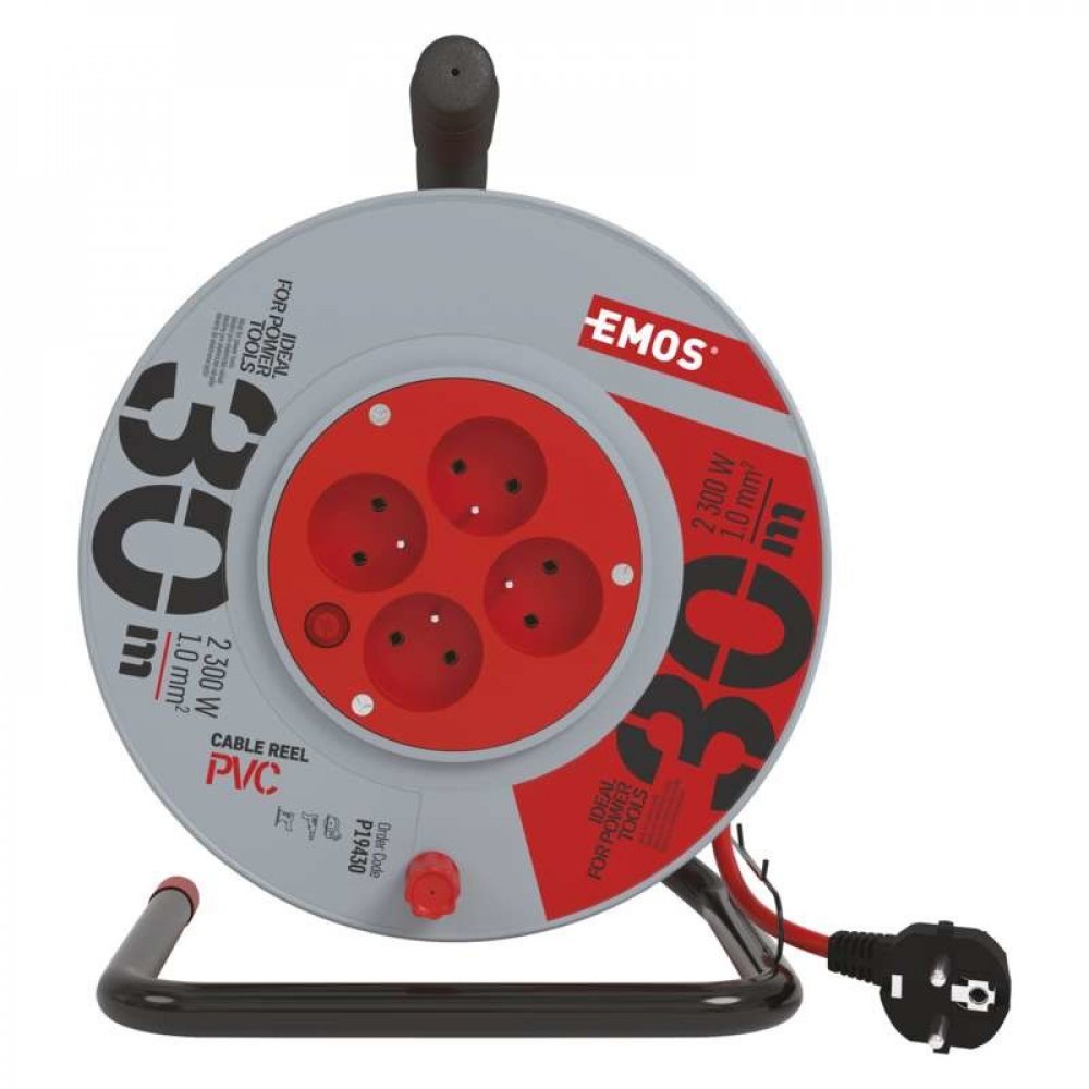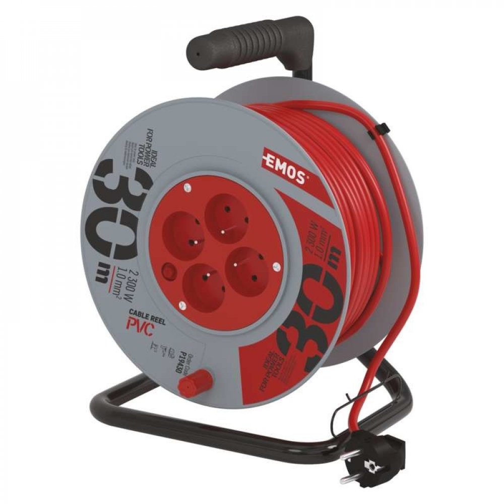 Kvalitní prodlužovací kabel na bubnu, 4x zásuvka, délka 30 m, lomená vidlice. Slouží k prodloužení elektrické energie tam, kam pevná zásuvka nedosáhne. Vhodné pro použití v domácnosti či v garáži.