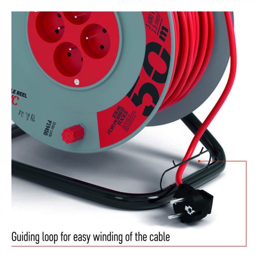 Tento model je vybaven pohyblivým středem bubnu, který usnadňuje manipulaci s kabelem bez zamotávání. Nechybí ani vodicí oko pro snadné navíjení a brzda cívky, která zabraňuje samovolnému odmotání během přenášení nebo skladování. Kabel je navinutý na odolné cívce z ABS plastu, která vydrží i tvrdší zacházení a pád ze stolu.