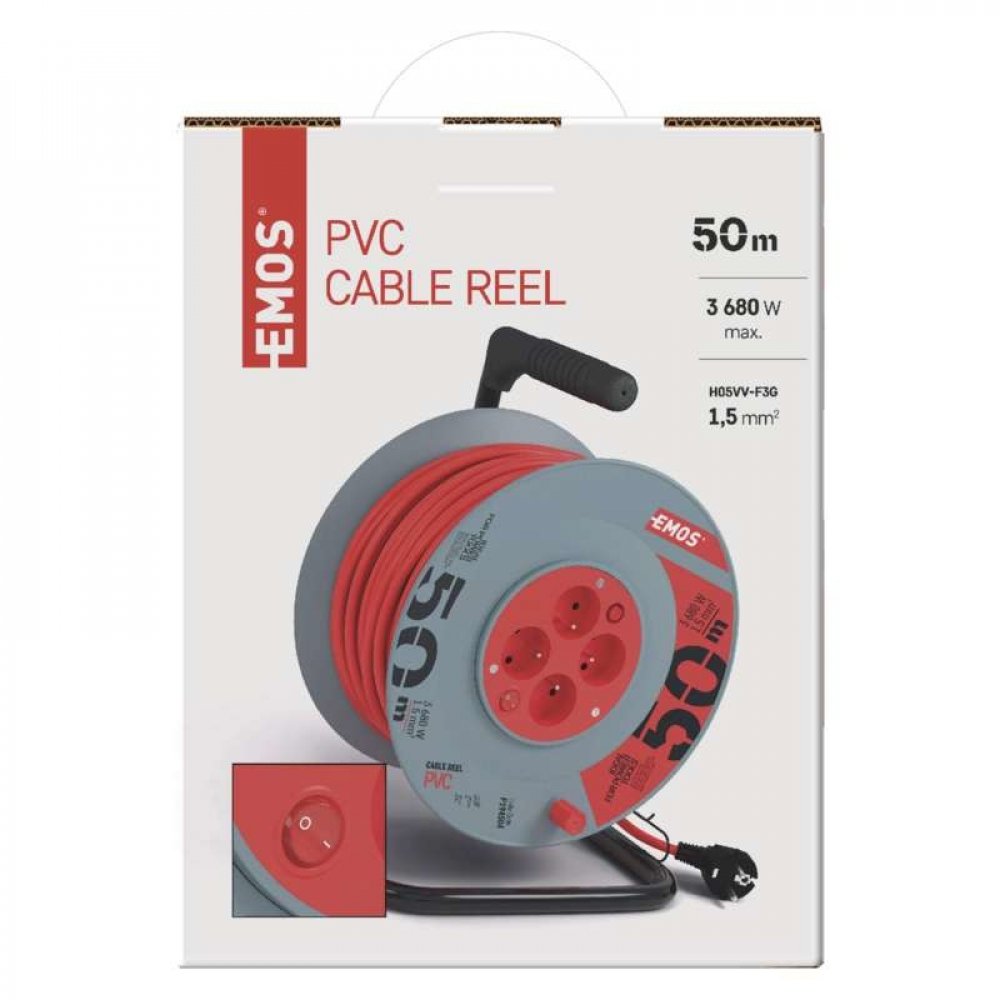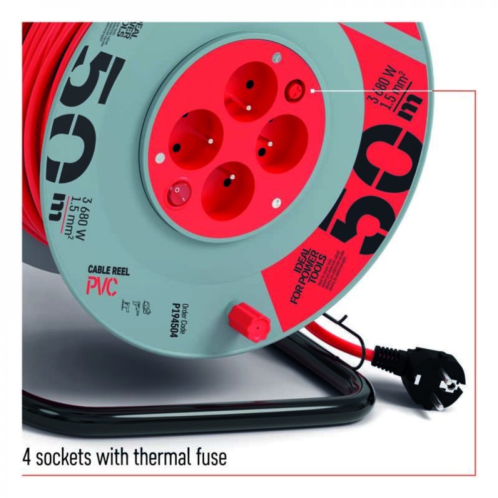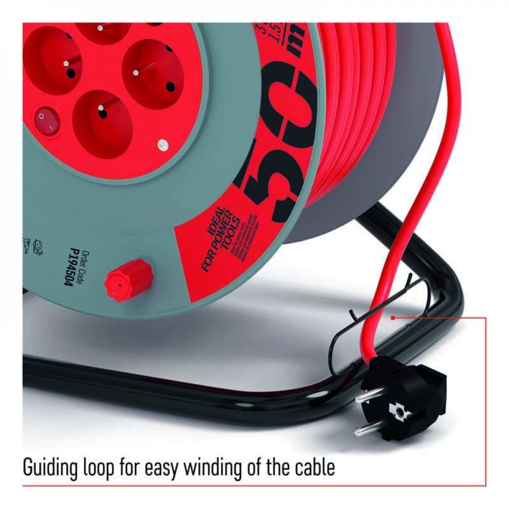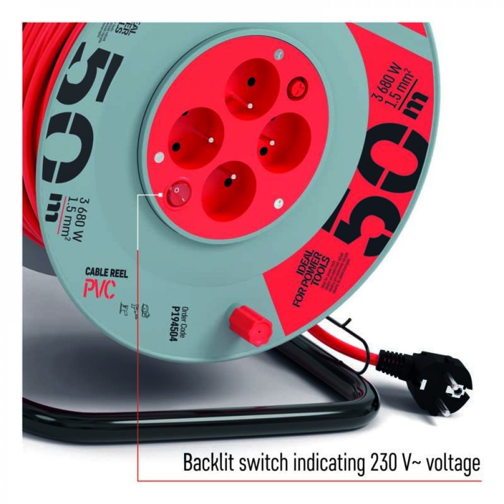 Prodlužovací kabel na navíjecím bubnu. Vodicí oko pro snadné navíjení kabelu. Zabraňuje spadnutí kabelu při navíjení z cívky navijáku. Podsvícený vypínač, který signalizuje napětí 230 V.
