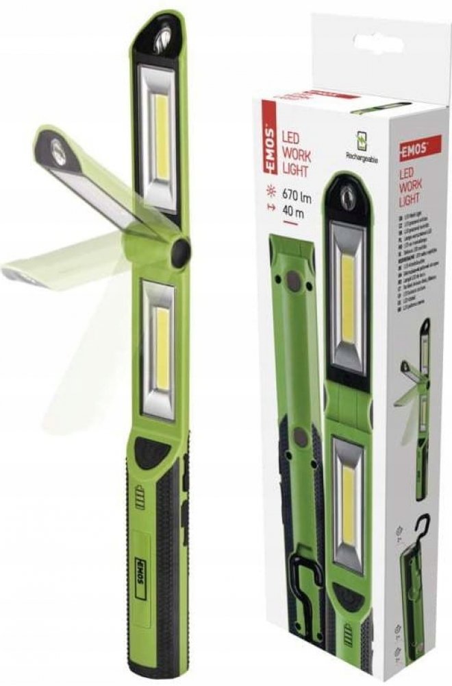 Svítilna je vybavena praktickým hákem pro snadné zavěšení a čtyřmi magnety pro ukotvení na kovovém povrchu. Pyšní se také sklopnou částí, kterou snadno nastavíte tak, aby vám světlo svítilo přesně pod takovým úhlem, jaký potřebujete. Tři světelné režimy, nabíjecí Li-Ion baterie a funkce ochrany proti neúměrnému nabití či přebití dělá svítilnu EMOS P4535 neocenitelným společníkem doma i na cestách.