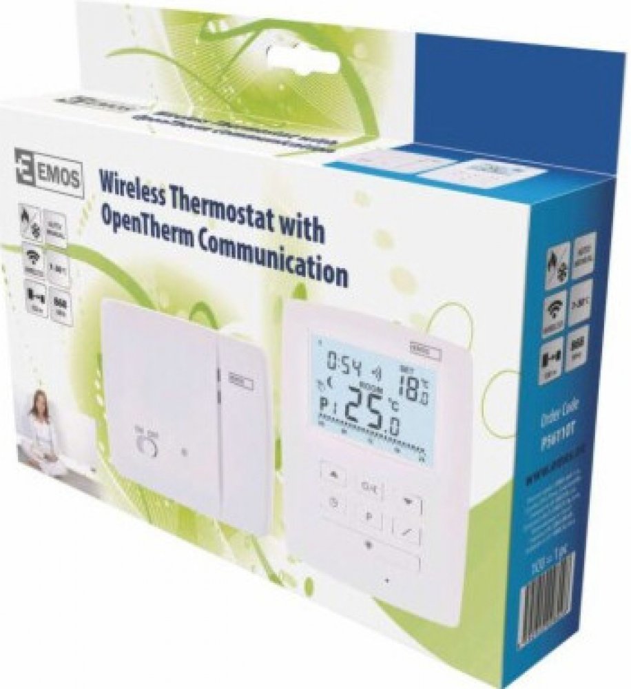 Termostat můžete připojit ke kotli, který podporuje OpenTherm komunikaci. Výhodou je regulace výkonu kotle nejen teplotou v místnosti, ale i teplotou vody v systému či dalšími proměnnými vlastnostmi. Ke spínání dochází pomocí OT i pomocí relé. Většina termostatů má buď jen OT výstup, nebo relé výstup. Termostat Emos P5611OT má pro připojení ke kotli oba výstupy.