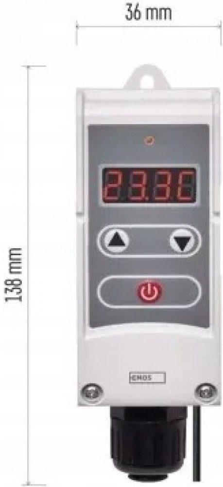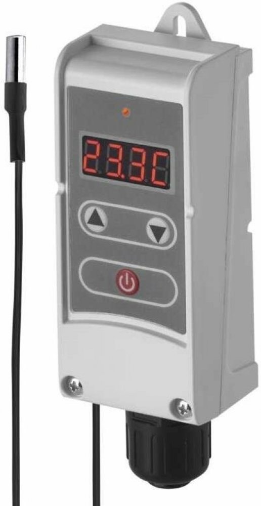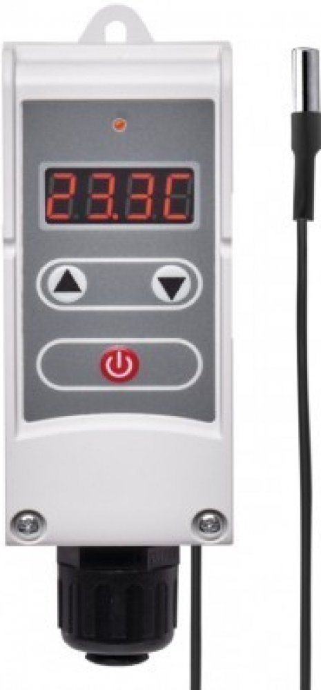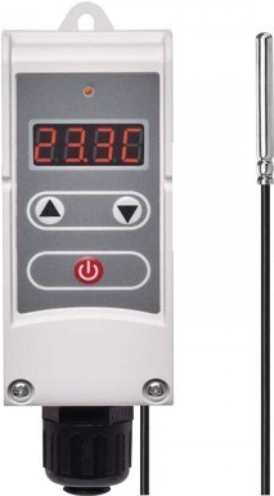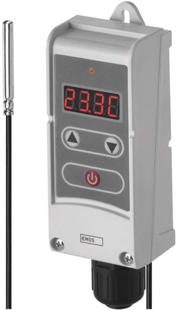 Příložný termostat s prodlouženým čidlem pro povrchovou montáž. Snímá teplotu vody v zásobnících teplé užitkové vody a nebo v topných systémech. Umožňuje regulaci teploty, hlídání teplotních omezení a funkci poklesu teploty. Jednoduchý provoz, možnost nastavení hystereze, digitální podsvícený displej, bezšroubový terminál. Teplotní rozsah termostatu je 5°C...