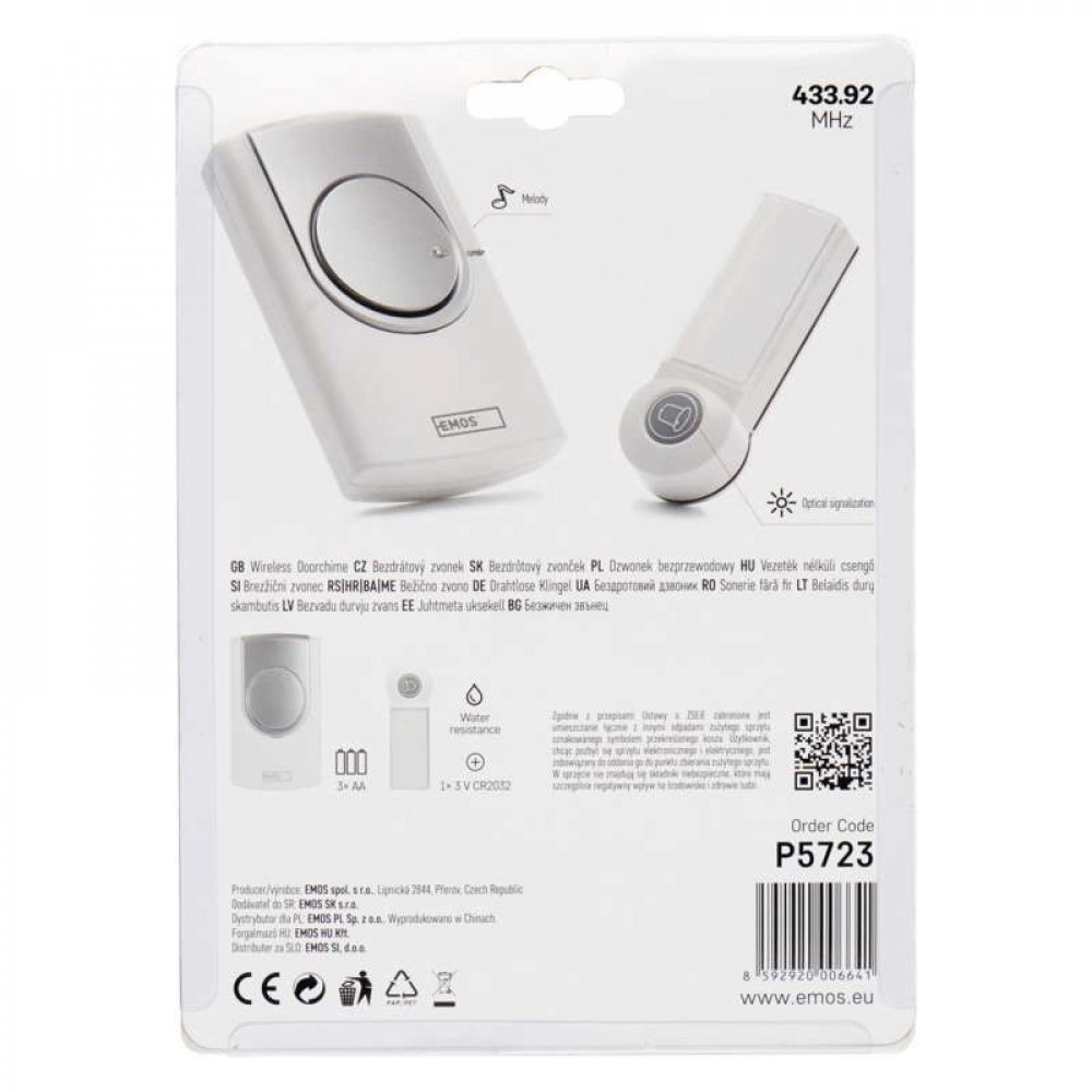Bezdrátový zvonek EMOS P5723 uspokojí všechny, kteří milují jednoduchost a spolehlivost. Díky dosahu až 100 m od základny můžete tlačítko zvonku umístit nejen ke dveřím, ale také k brance nebo třeba na plot. Tlačítko zvonku je také opatřeno světelnou signalizací. Vaši hosté si tak budou vždy stoprocentně jisti, že spolehlivě funguje a třeba v něm právě nedošly baterky.
