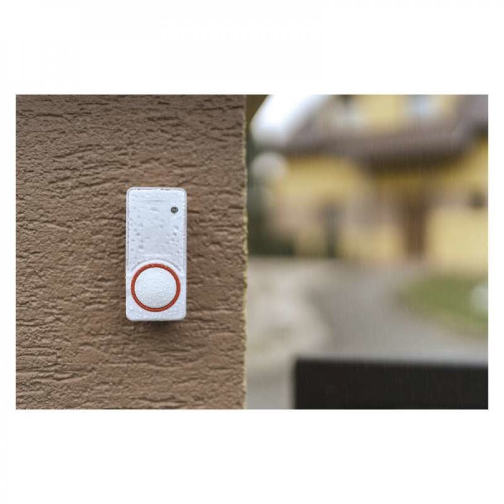 Tlačítko ke zvonku s krytím IP44 je plně připraveno i na vlivy nepříznivého počasí. Můžete ho tak umístit ke dveřím i k brance. Souprava má tzv. funkci „self-learning“ – zvonek má schopnost vygenerovat vlastní párovací kód, který tlačítko poté přijme a uloží si ho do paměti. Díky této funkci nejsou ovlivňovány soudední zvonky. Sestavu tak lze rozšiřovat doplňkovými tlačítky.