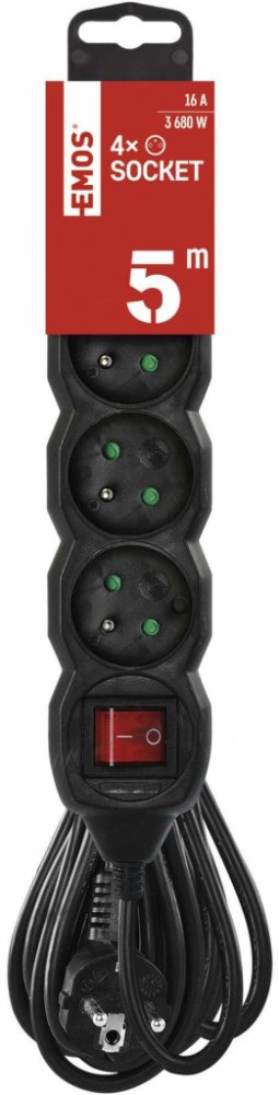 EMOS 4 5 m černé do interiéru pro domácí spotřebiče bez USB portů IP20 16 A 1.5 mm² prodlužovací lišta s běžným konektorem (Schuko / typ E/F) 3680.0 W