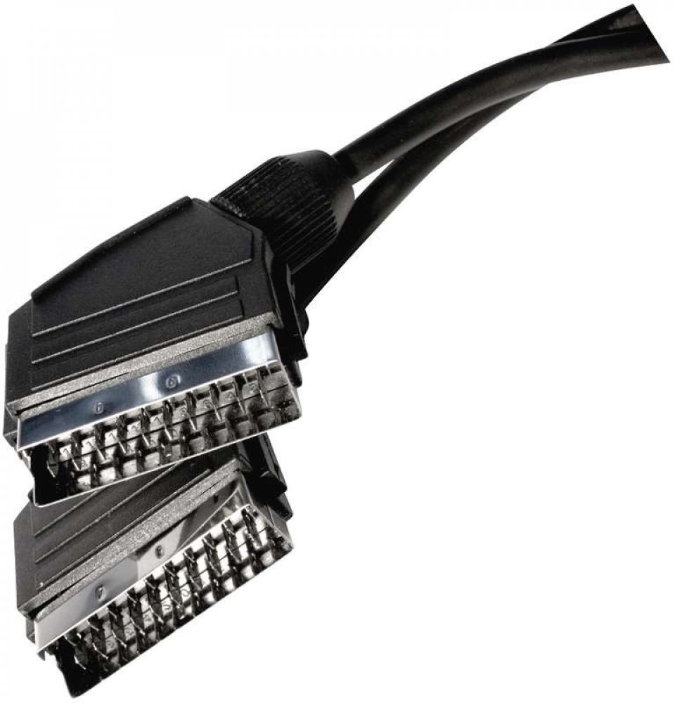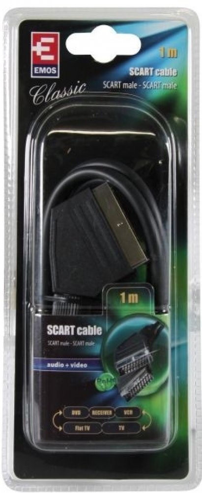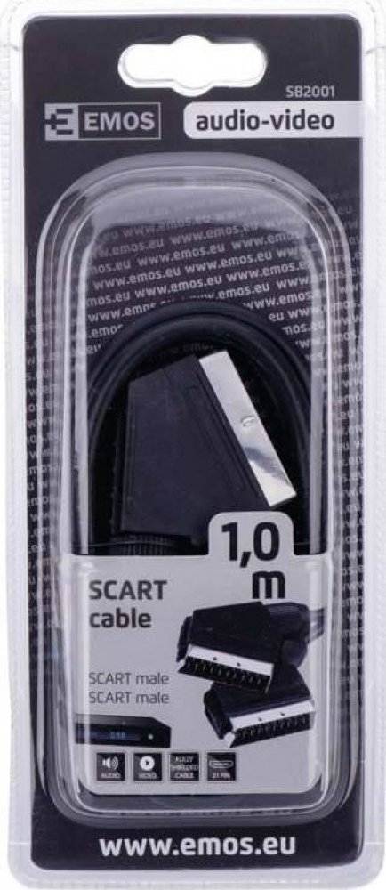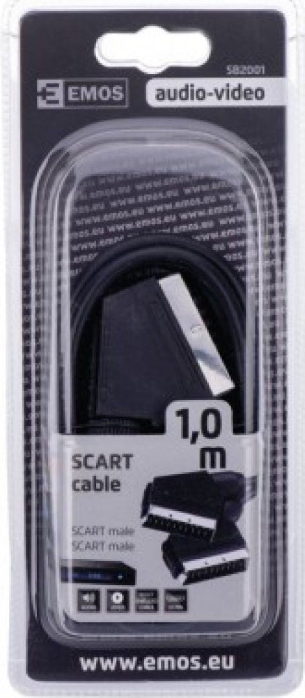 SCART kabel s vidlicemi SCART. Kabel má délku 1 m. SCART kabel je plně stíněný pro redukci elektromagnetického rušení. Kabel SCART je vhodný pro DVD, RECEIVER, VCR, FLAT TV, TV.