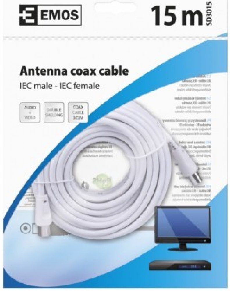 Anténní koaxiální kabel s vidlicí a zásuvkou IEC. Kabel má dvojité stínění pro redukci elektromagnetického rušení. Délka kabelu je 15 m. Koaxiální kabel je vhodný pro SAT, DVB-T, ANT, DECODER, FLAT TV a TV.
