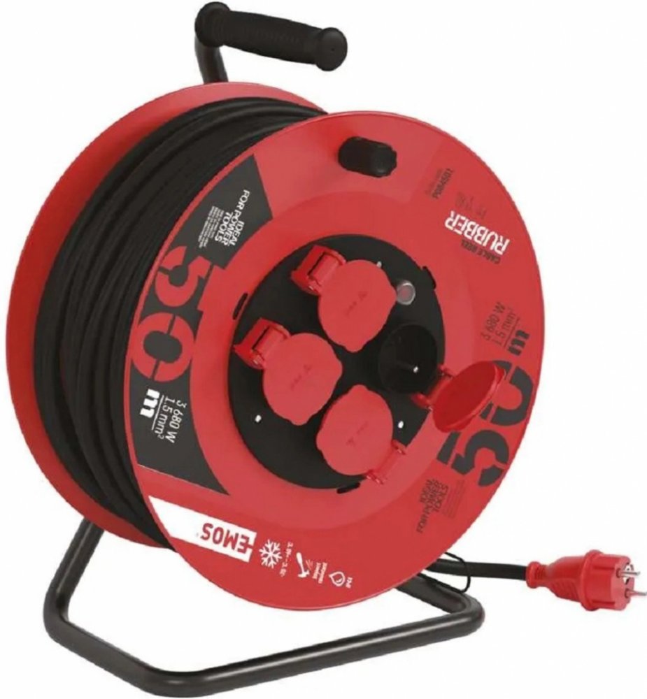 EMOS Venkovní prodlužovací kabel na bubnu 50 m Kvalitní gumový EMOS prodlužovací kabel s délkou 50 m vám nabízí 4 zásuvky, tepelnou pojistku a cívku z téměř nerozbitného ABS plastu. Odolá nechtěným pádům a při správné péči vám bude sloužit dlouhá léta. Prodlužovací gumový kabel na bubnu je určený pro ty, kteří se živí jako stavař, elektrikář nebo montér, ale stane se dokonalým parťákem i pro nároč...