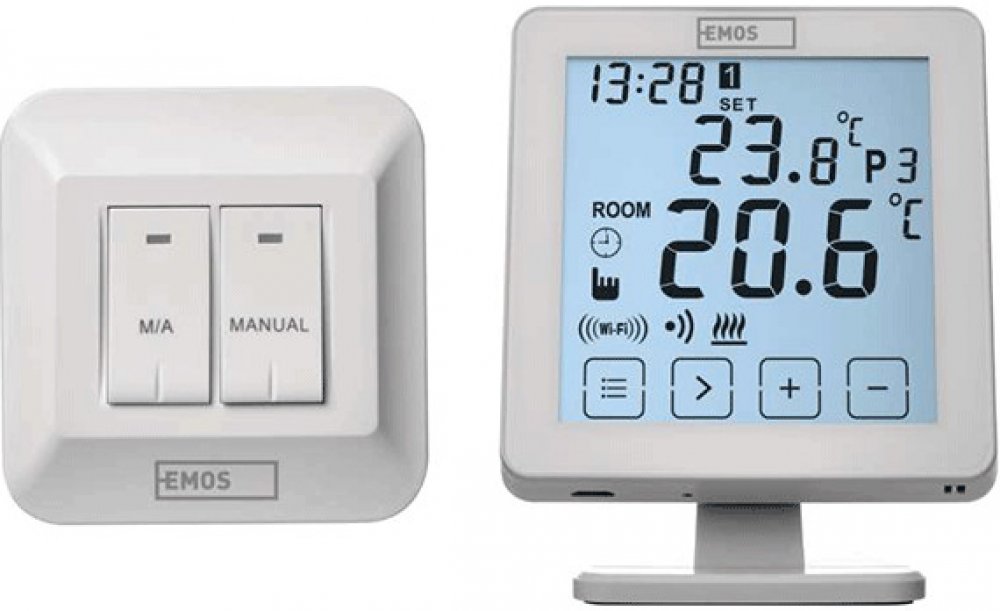 Digitální pokojový WiFi termostat EMOS P5623 Elektronický pokojový termostat EMOS pro regulaci teploty podle nastavitelného časového programu. Možnost ovládání pomocí mobilní aplikace přes chytré telefony (iOS, Android). Nastavení teploty od 5 ° C až do 35 ° C, rozlišení 0,5 ° C. Jednoduchá a intuitivní obsluha. Technické parametry: Typ termostatu: bezdrátový Typ ovládání: programovatelný elektronický pokojový termostat, Možnost ovládání: přes mobil (iOS, Android) Podsvícený displej: ano Druh regulace: topný systém Typ nastavení teploty: 6 teplotních změn denně Měření teploty: 0 ° C až 40 ° C, rozlišení 0,1 ° C Nastavení teploty: 5 ° C do 35 ° C, rozlišení 0,5 ° C Nastavitelný rozptyl teploty: ± 0,3 ° C Ochrana proti zamrznutí: ano Funkce Set-back: ne Funkce ON / OFF: ano Funkce prázdniny: ano Dosah ve volném prostoru: 80 m Pracovní frekvence: 868 MHz Spínání: 230 V AC nebo beznapěťové Spínaná zátěž: 16 A odporově, 4 A induktivní Délka kapilárního čidla: neuvádí se Možnost propojení s dalšími detektory: neuvádí se Barva: bílá Napájení vysílače: 5 V Napájení přijímače: 230 V AC Rozměr přijímače: 26 × 86 × 86 mm Rozměr vysílače: 15 × 96 × 96 mm Součást balení: bezdrátový termostat, bezdrátový přijímač, USB Adaptér 5 V / 1,5 A, micro USB kabel 1,5 m V manuálu najdete podrobný navod i QR kód ke stažení aplikace. Ke stažení