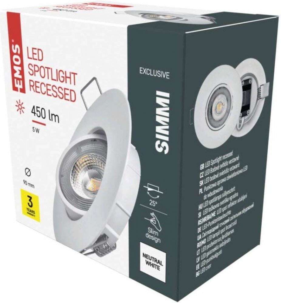 LED bodové svítidlo SIMMI s průměrem 9 cm je ideální pro vnitřní použití, nabízí výkon 5 W a světelný tok minimálně 450 lm. Toto svítidlo je nestmívatelné a poskytuje vyzařovací úhel 110°, což zajišťuje široké rozptylování světla. S životností až 25 000 hodin je toto svítidlo nejen výkonné, ale také velmi úsporné, s úsporou elektrické energie až 80 % oproti klasické žárovce.