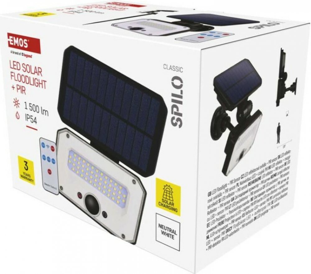 Emos ZG132S | Solární LED reflektor SPILO s pohybovým čidlem, 1500 lm, Li-Ion 3600 mAh, neutrální bílá