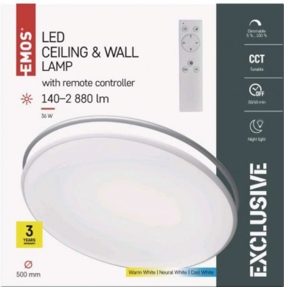 Emos bílá ocel pro velké místnosti pro instalaci svépomocí přisazená univerzální povrchová 4600 K 36 W IP20 pouze do suchých vnitřních prostor 220-240 V 2880 lm 6.0 cm 2.544 kg 50 cm 6.0 cm