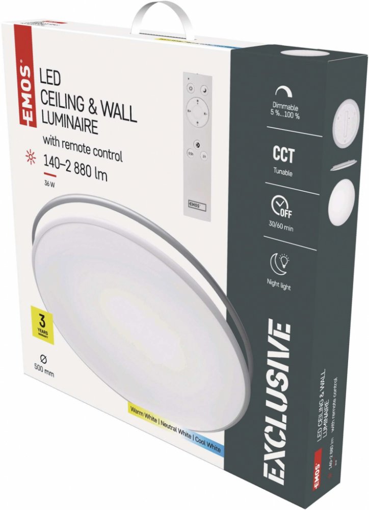 Chytré svítidlo EXCLUSIVE nejlépe poslouží pro osvětlení moderních interiérů, prostor v kancelářích, hotelech, nebo domácnostech. Tělo svítidla je vyrobeno z pevného a trvanlivého ocelového plechu, difuzor pak z lehkého plastu. V balení najdete rámečky ve 2 barvách (bílá a stříbrná) a můžete si tak sami zvolit výsledný design svítidla. Výhodou je velmi nízká hmotnost i jednoduchá instalace LED svítidla. Svítidlo můžete umístit jak na stěnu, tak i na strop. Můžete si u něj nastavit barvu světla od studené bílé po teplou bílou, nechybí funkce stmívání, nebo ambientního osvětlení - která navozuje kouzelný efekt osvitu stropu okolo svítidla. Přisazené svítidlo EXCLUSIVE má klasický kruhový tvar a uvnitř ukrývá moderní, velmi úsporné a trvanlivé LED diody s vysokou světelnou účinností a životností 25 000 hodin. Skrz krycí mléčný difuzor vyzařuje světlo rovnoměrně a příjemně v širokém úhlu 115°.
